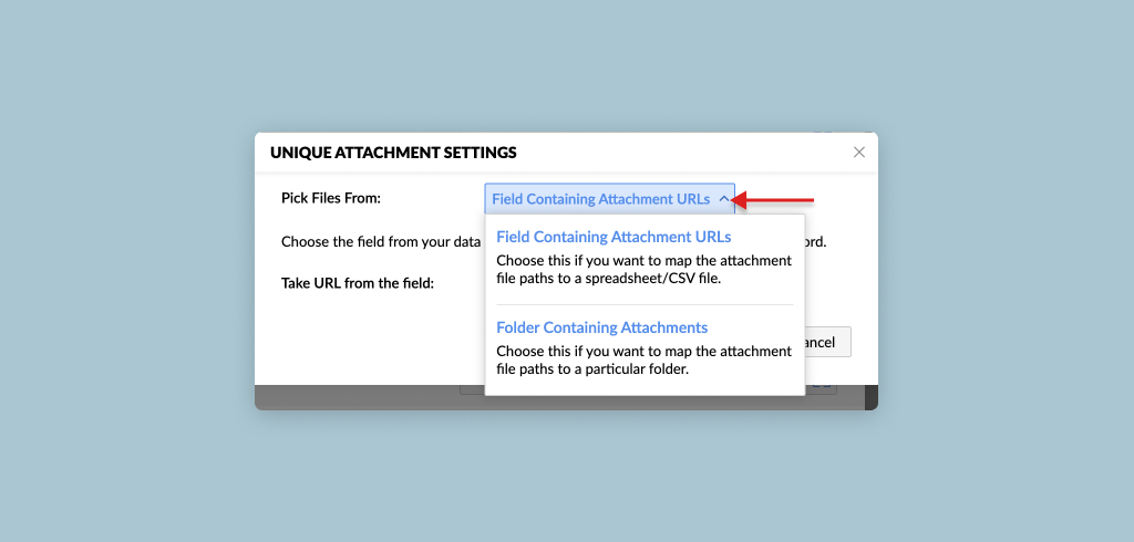 1. Field containing Attachment URLs - If the URL of a file is present in a field in the data source, you can choose the appropriate field and the file will be added as an attachment.