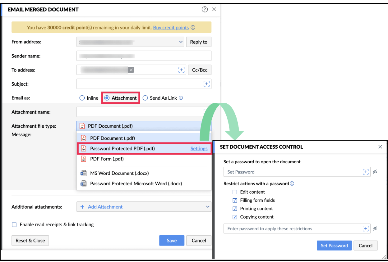 Zoho Writer allows you to secure your merged documents with a password before sending them via email. When this setting is enabled, each generated document is encrypted, and recipients must enter the correct password to open the file.