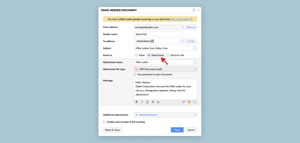 The merged document will be attached to the email in the selected format; you can also choose to enter a custom message along with the email while delivering the merged document as an attachment. The size limit to attachments is 3MB per attachment.