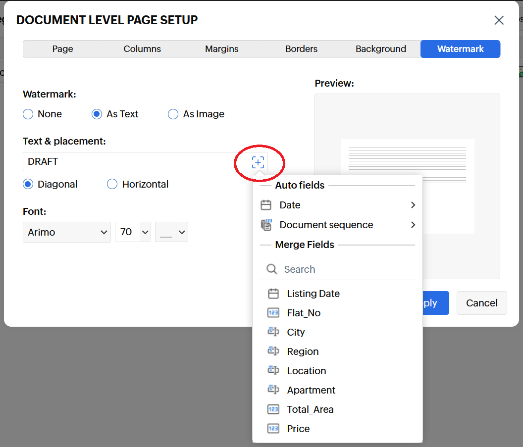 2. Choose Watermark As Text , and click on plus icon in the Text & placement field to choose the merge field value to be used as watermark text.