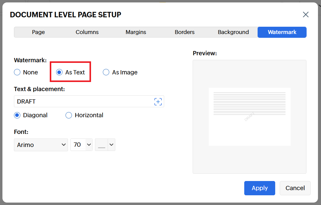 2. In the Document Level Page Setup window, go to the Watermark tab.