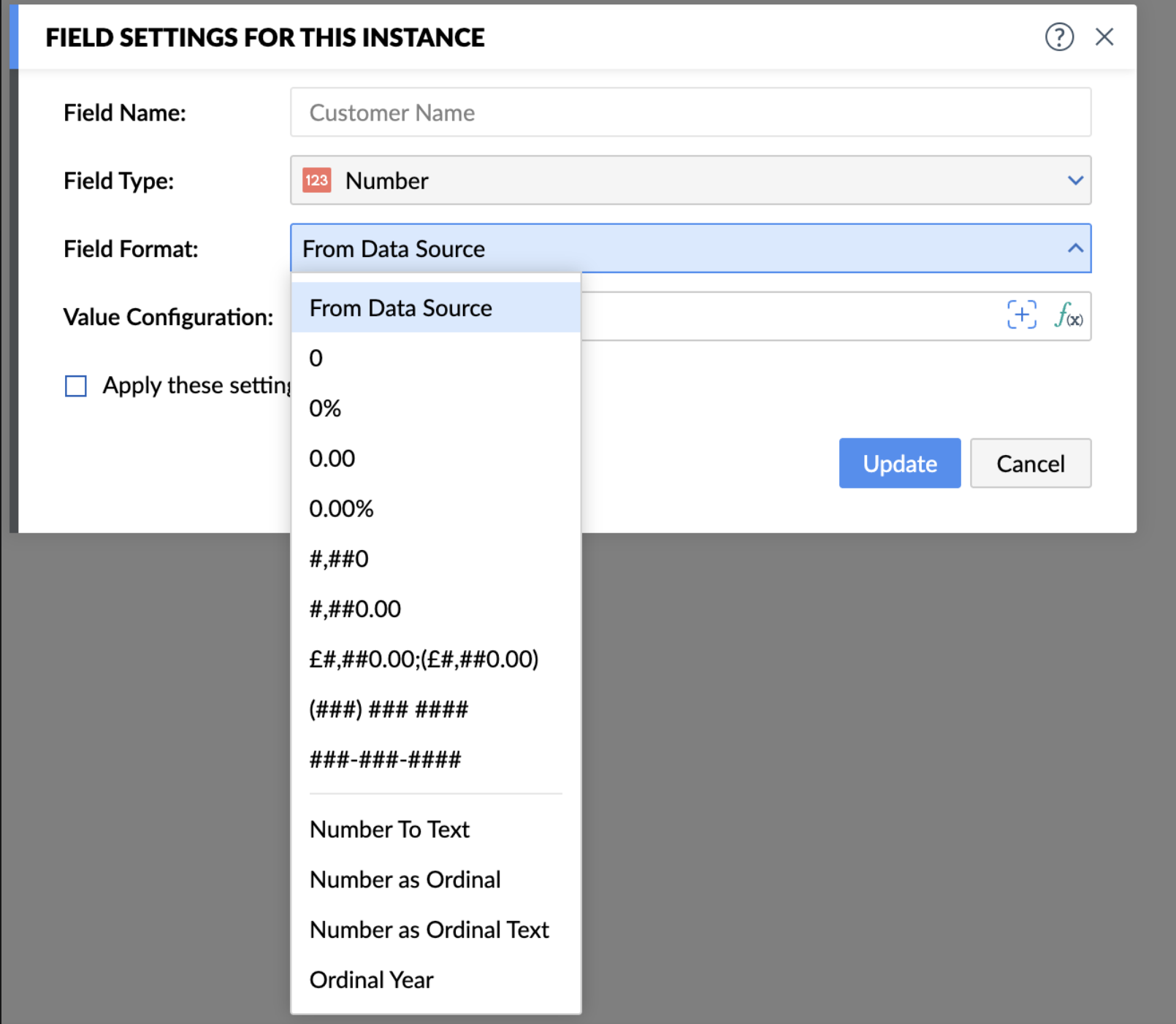 | Checkbox | The checkbox appears checked or unchecked depending on the data source value. | TRUE | true | Yes | 1 for checked FALSE | false | No | 0 for unchecked |