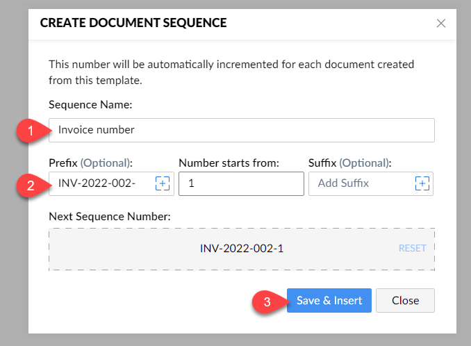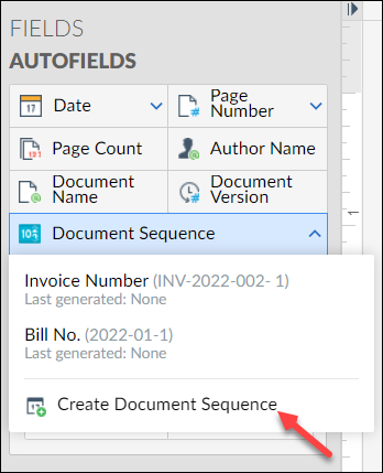 Open your merge template, navigate to Fields > Document Sequence > Create Document Sequence under Autofields.