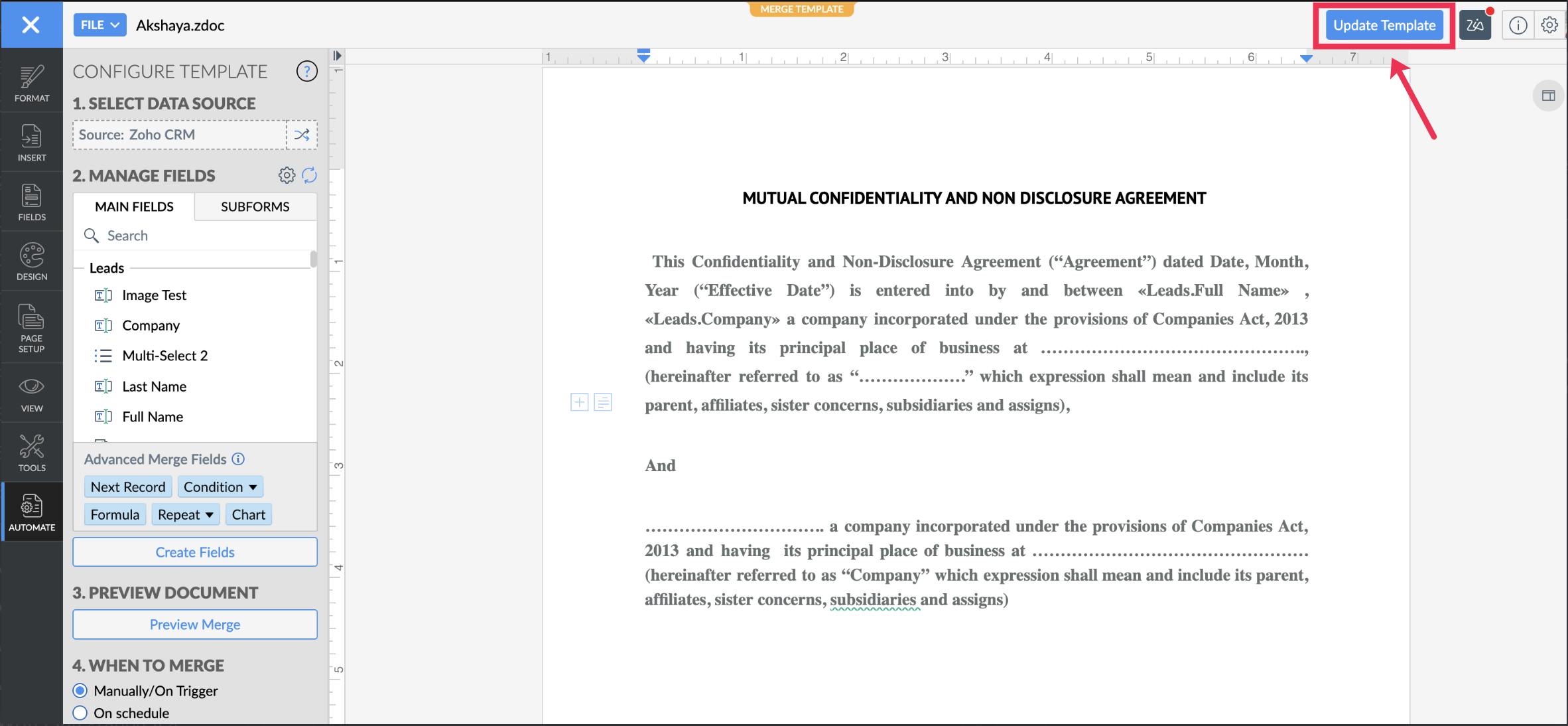How the merge template behaves in Zoho CRM