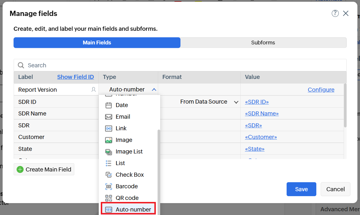 Step 4. Click Create Main Field. In the Manage Fields dialog that opens, enter a name for the field, and select Auto-number as the field type, as shown in the image below, and hit Save. The field will be listed in the Main Fields tab. You can add it to your document from there.