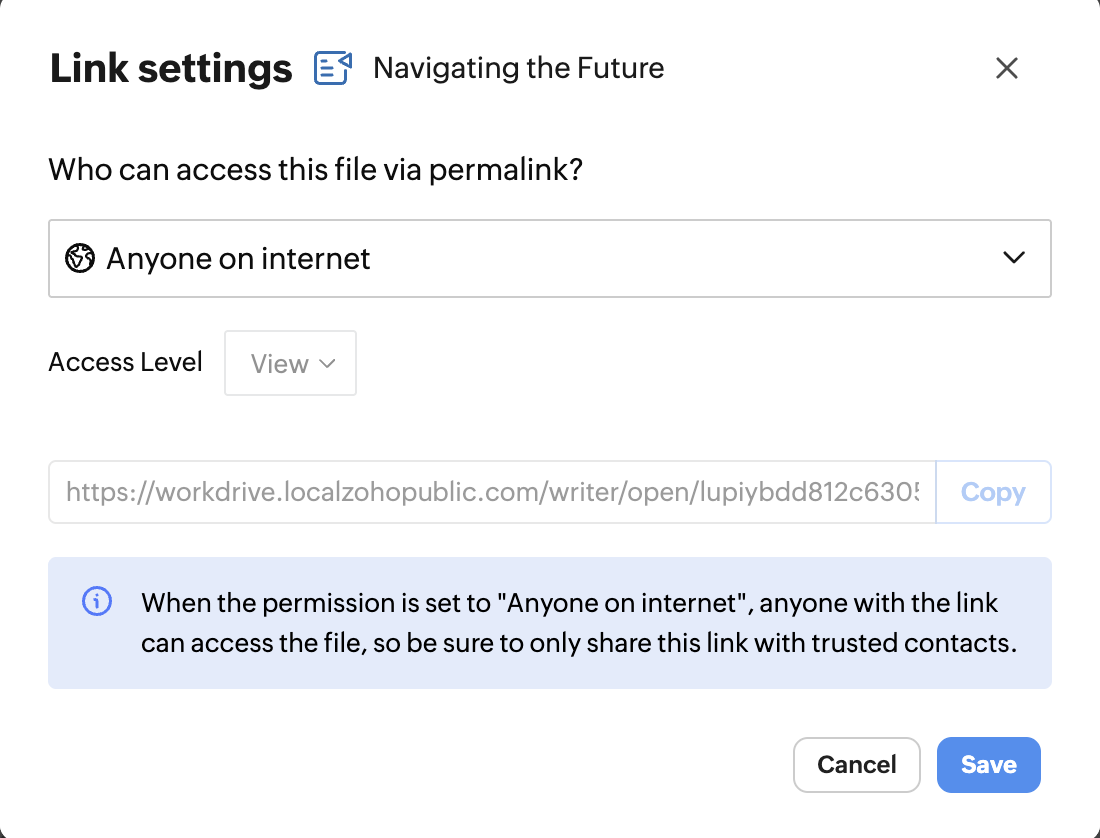 - Choose Anyone on internet under the Who can access this file via permalink?