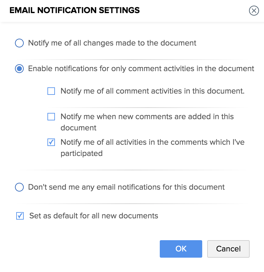 To receive alerts only for replies to your own comments, select Notify me of all activities in the comments I’ve participated in. You can also make your selection the default for all future documents by checking Set as default for all new documents.