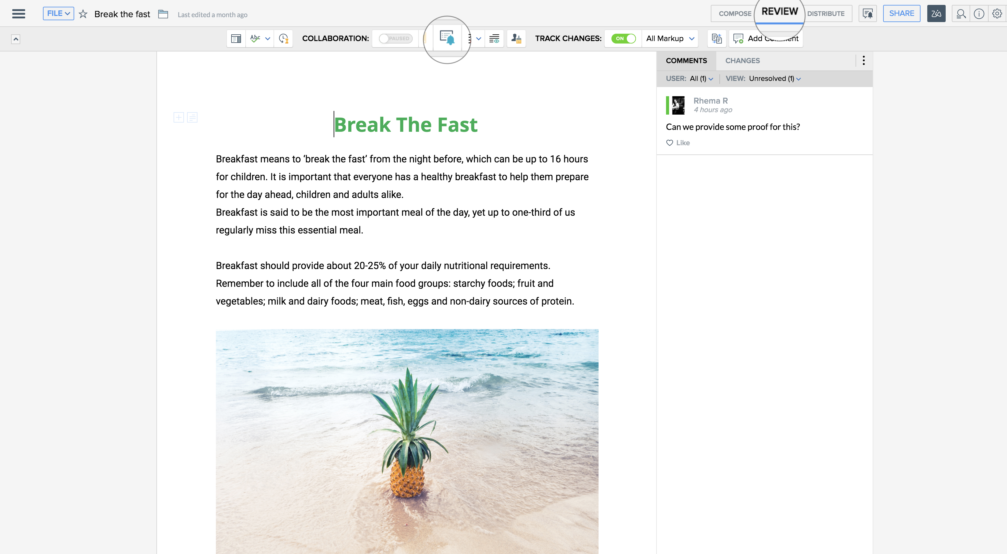 - Click the Review button at the top of your document to switch to Review mode. A right pane is displayed with the edits made to the document.