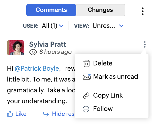 - To delete the comment, click the three dot icon > Delete.