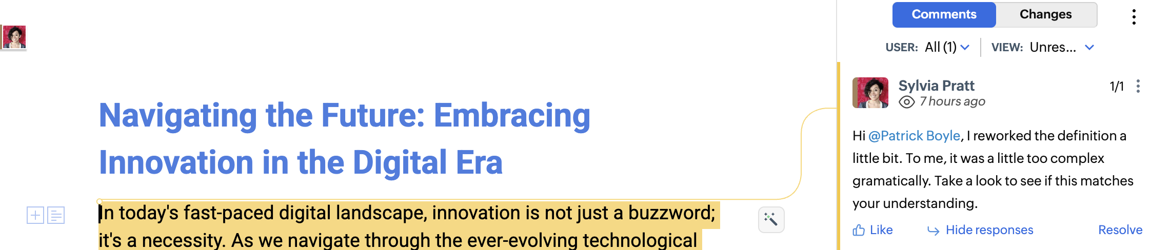 - Resolve or delete comments—resolving fades the highlight and marks completion, while deleting removes the comment entirely.