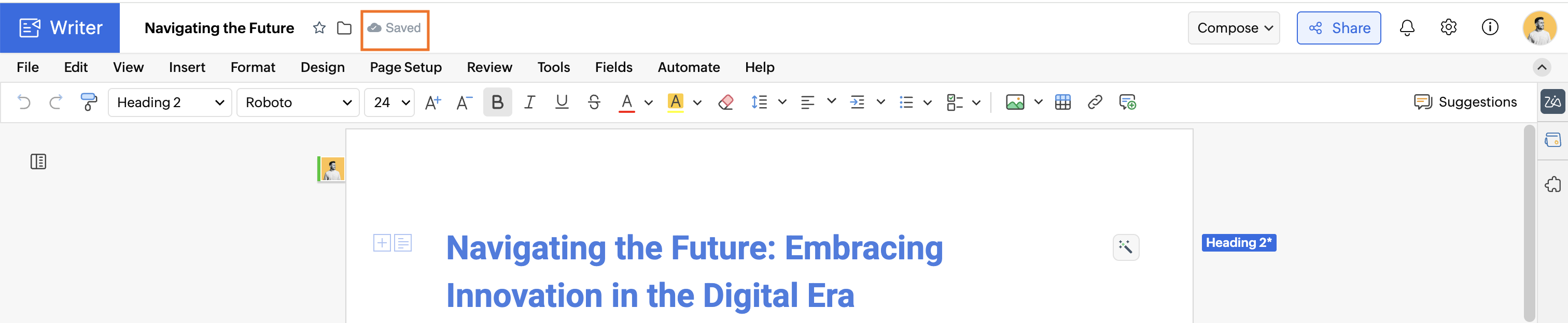 Overview Document revisions in Zoho Writer help you to easily track and manage every change made to your document over time. You can view the full version history, download or restore older versions, bookmark important milestones, and even combine ...