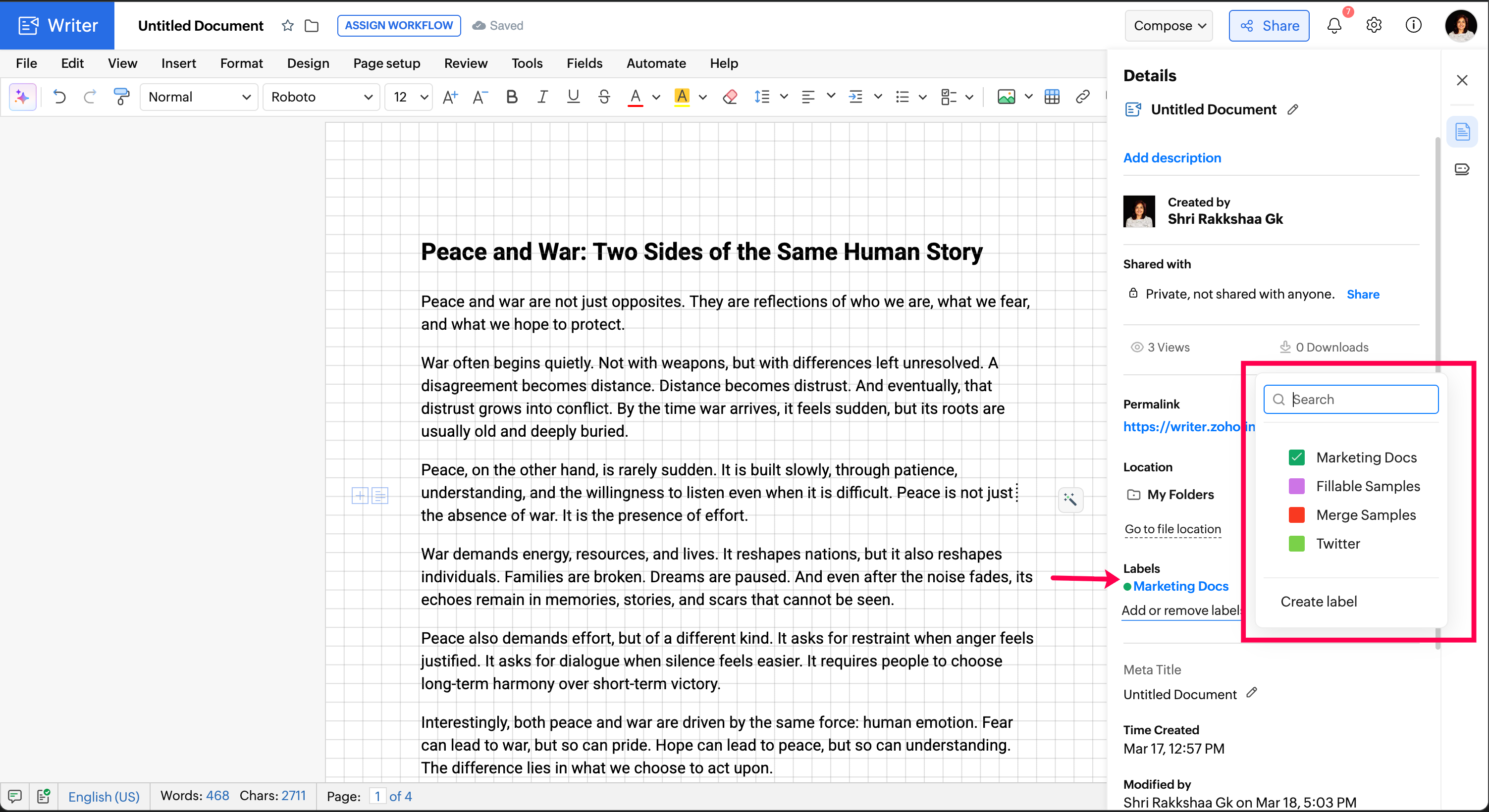 Note: Labeling is available only for documents stored in Zoho WorkDrive.