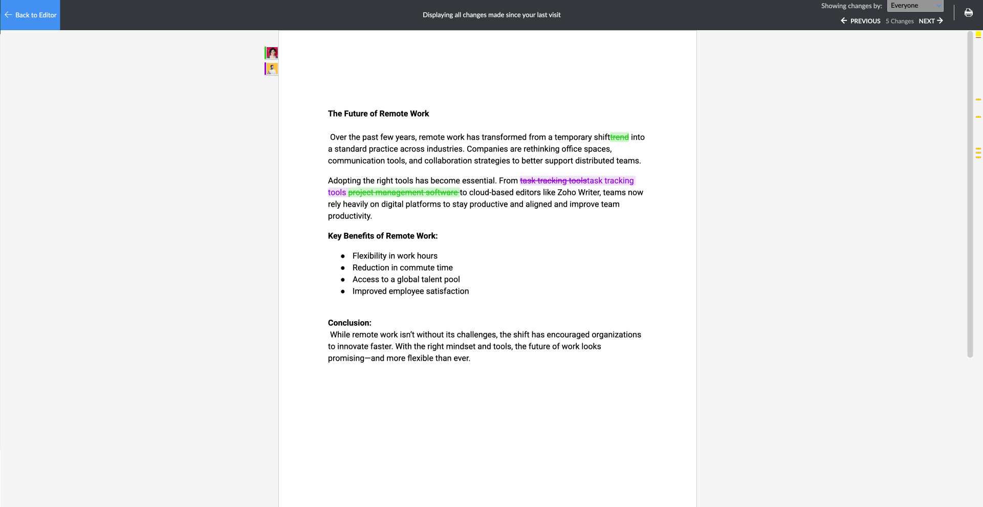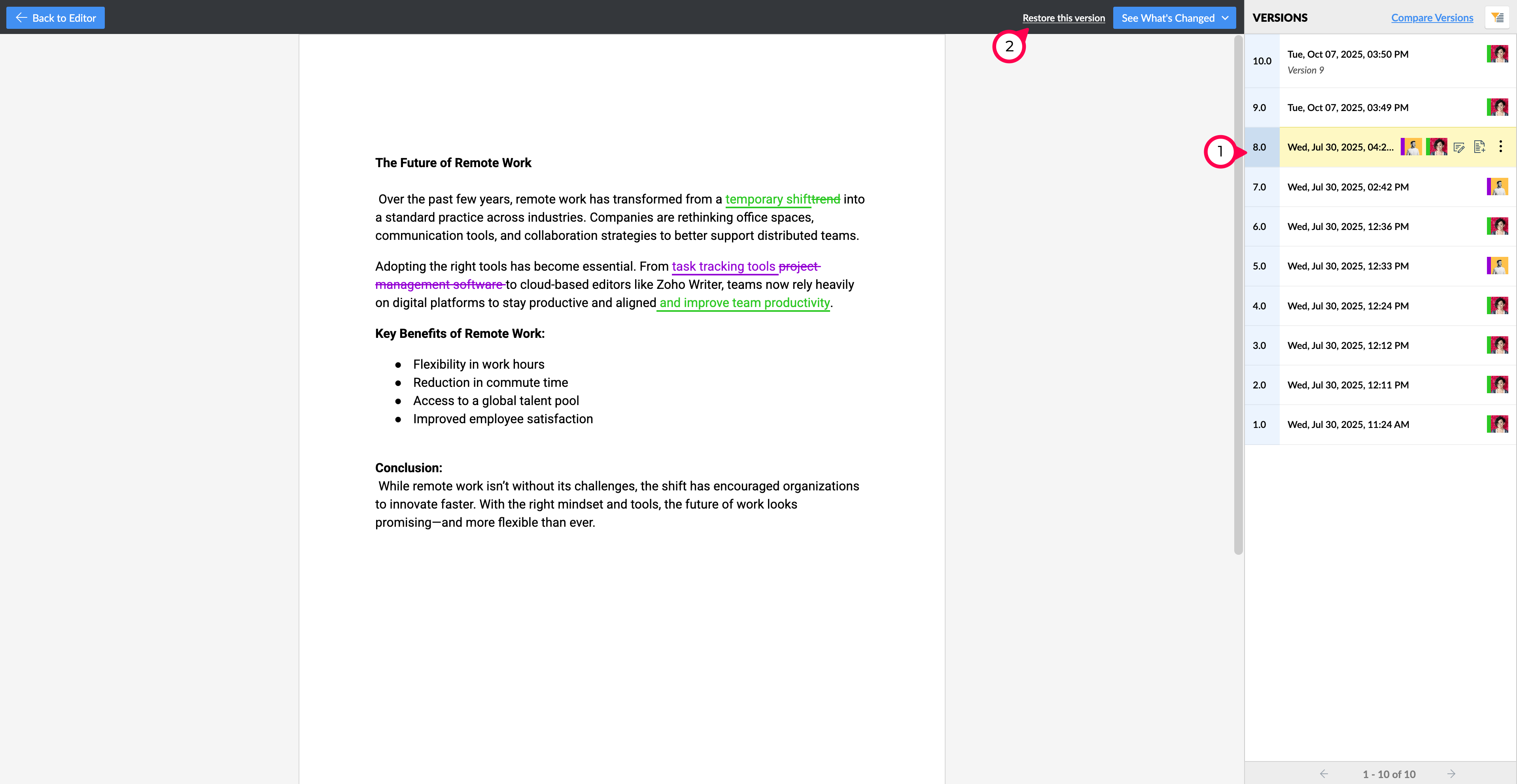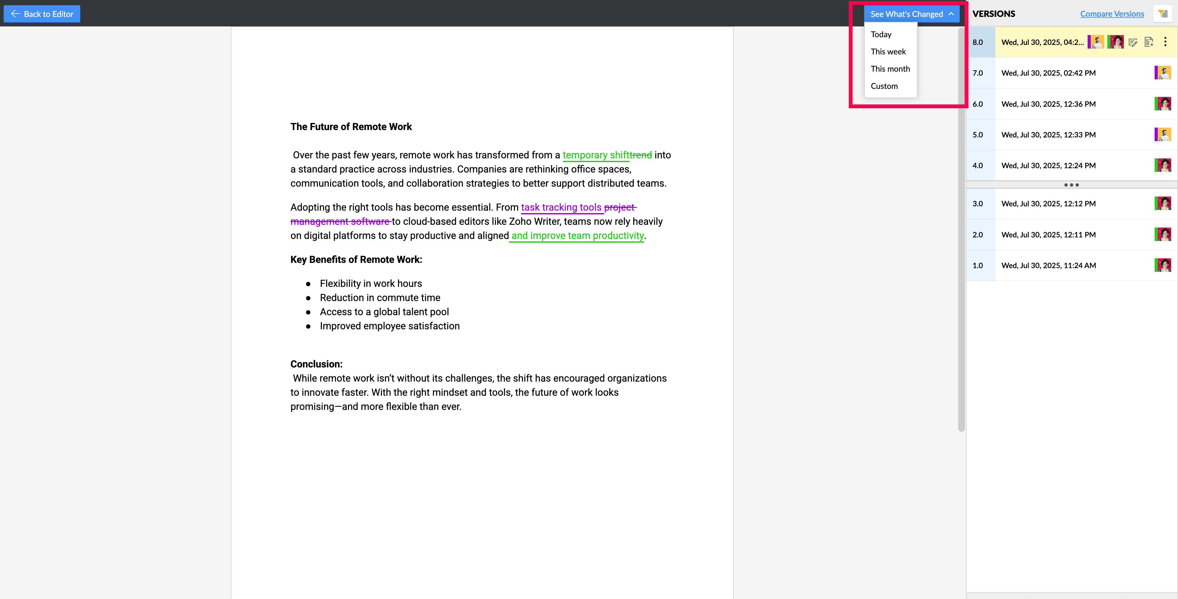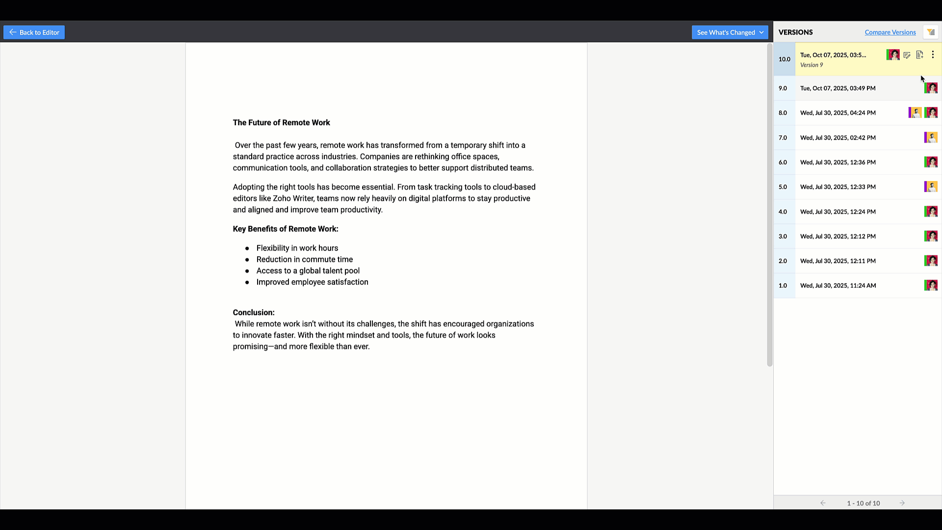 This lets you quickly understand how your document has evolved and who made changes.