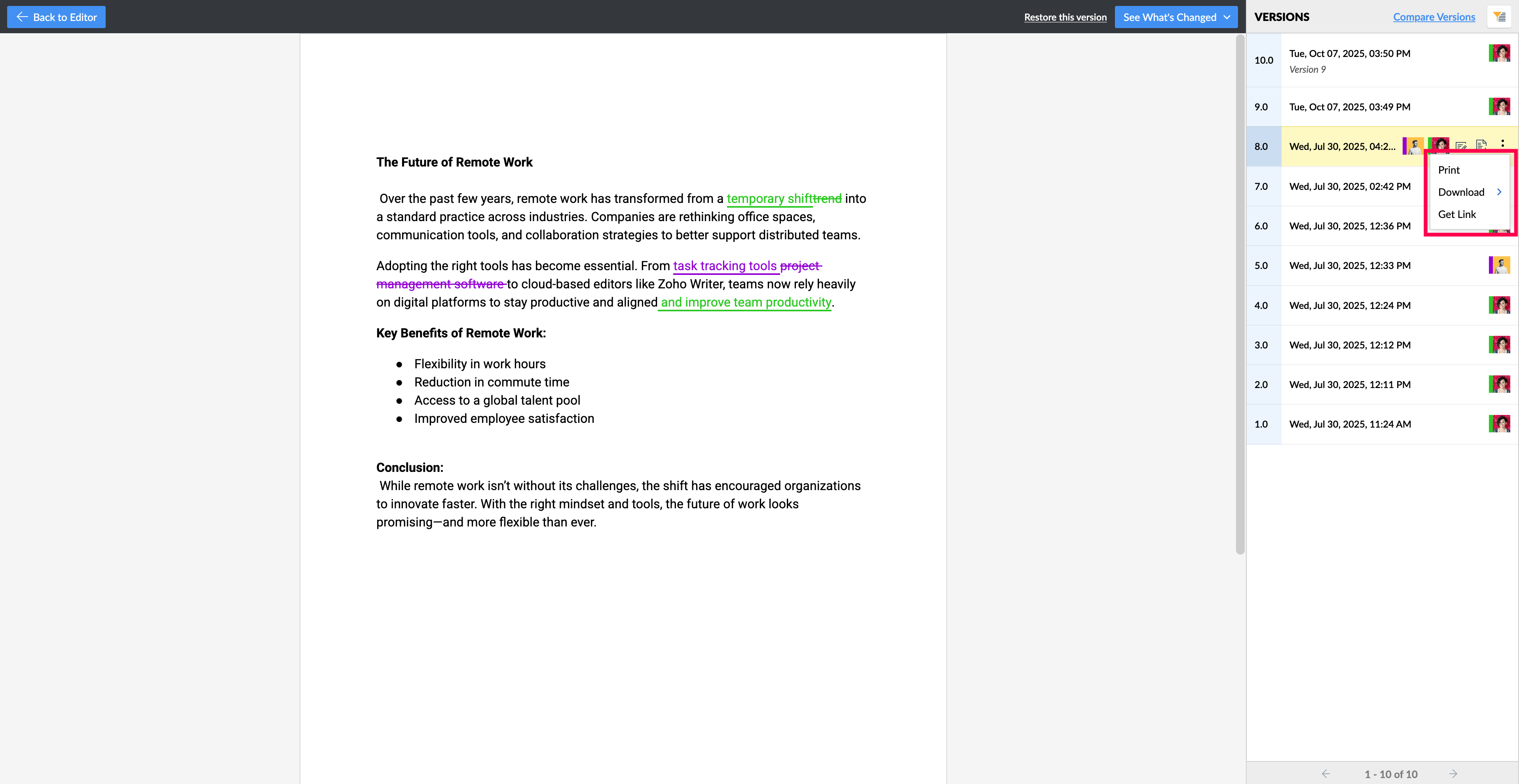 Document revisions in Zoho Writer help you to easily track and manage every change made to your document over time. You can view the full version history, download or restore older versions, bookmark important milestones, and even combine revisions from multiple reviewers in one place. This makes collaboration smoother and document management easier.