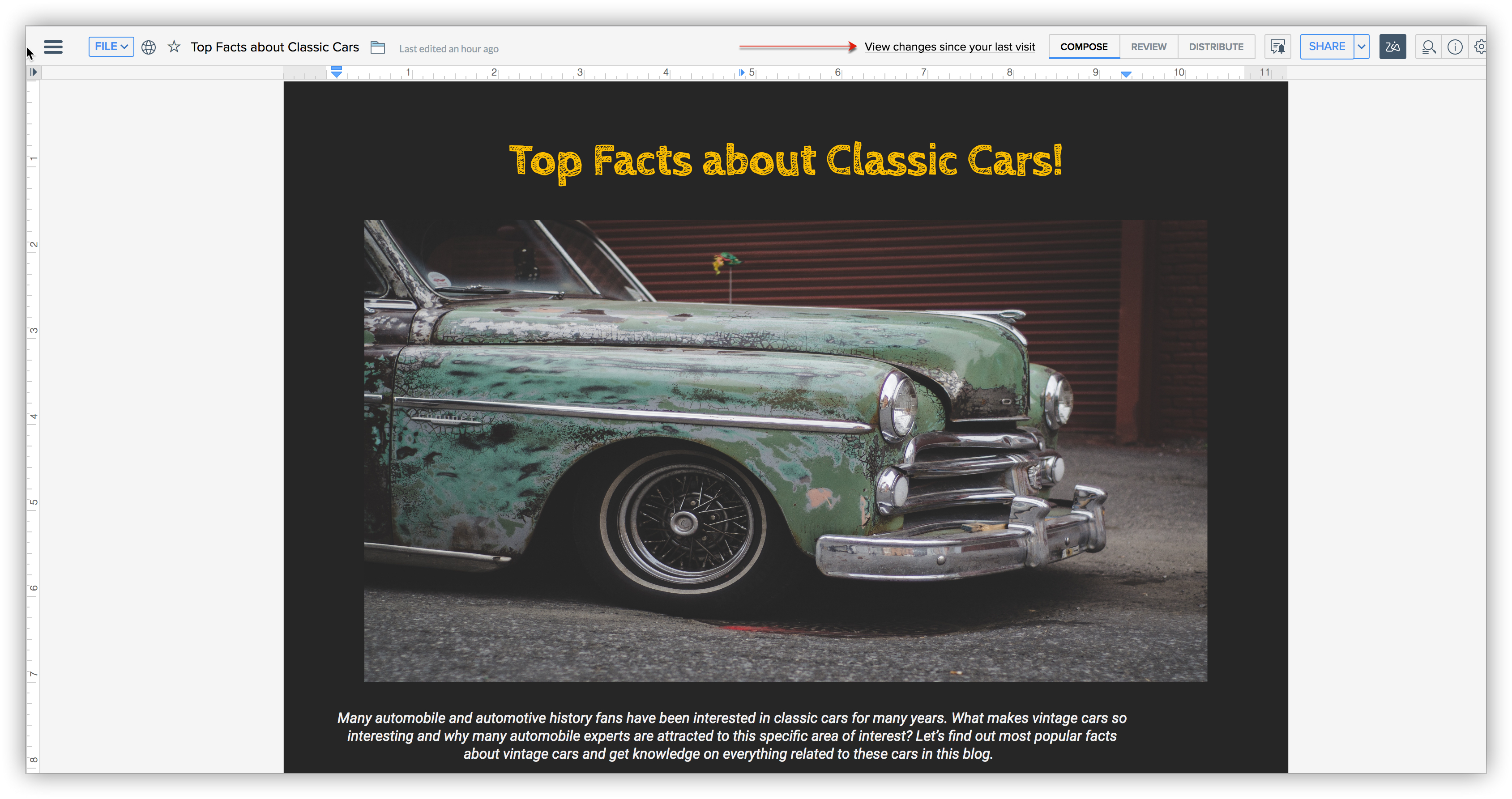 - Click on View changes since your last visit link next to the Compose mode. The changes made by other users will be highlighted. The changes will be color-tagged for each user and you can keep track of what each user has modified in your document.
