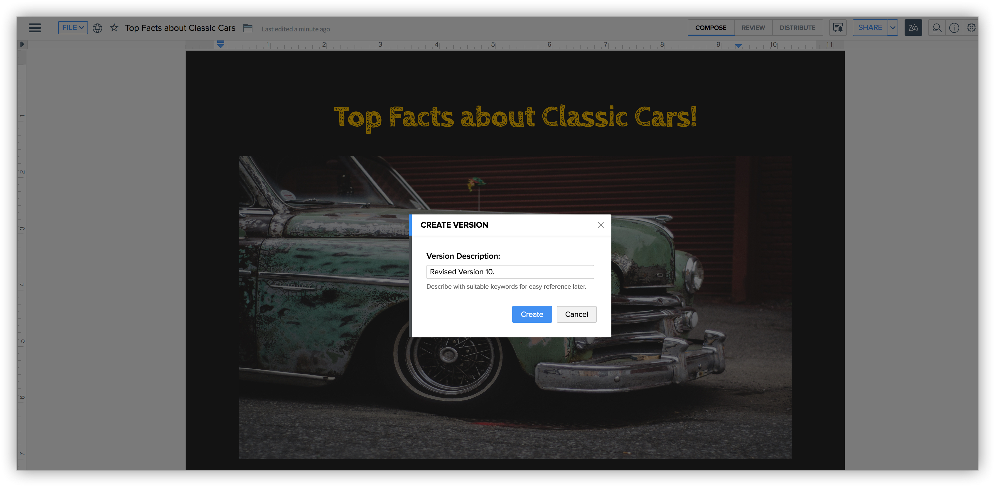 Document revisions simplifies the way you use version history and make it easy for you to see the changes over time. This is your one-stop hub to keep track of all that's happened in your document since you last visited. You can also view different versions of a document, download an older version, switch to previous version, bookmark a particular version and much more.