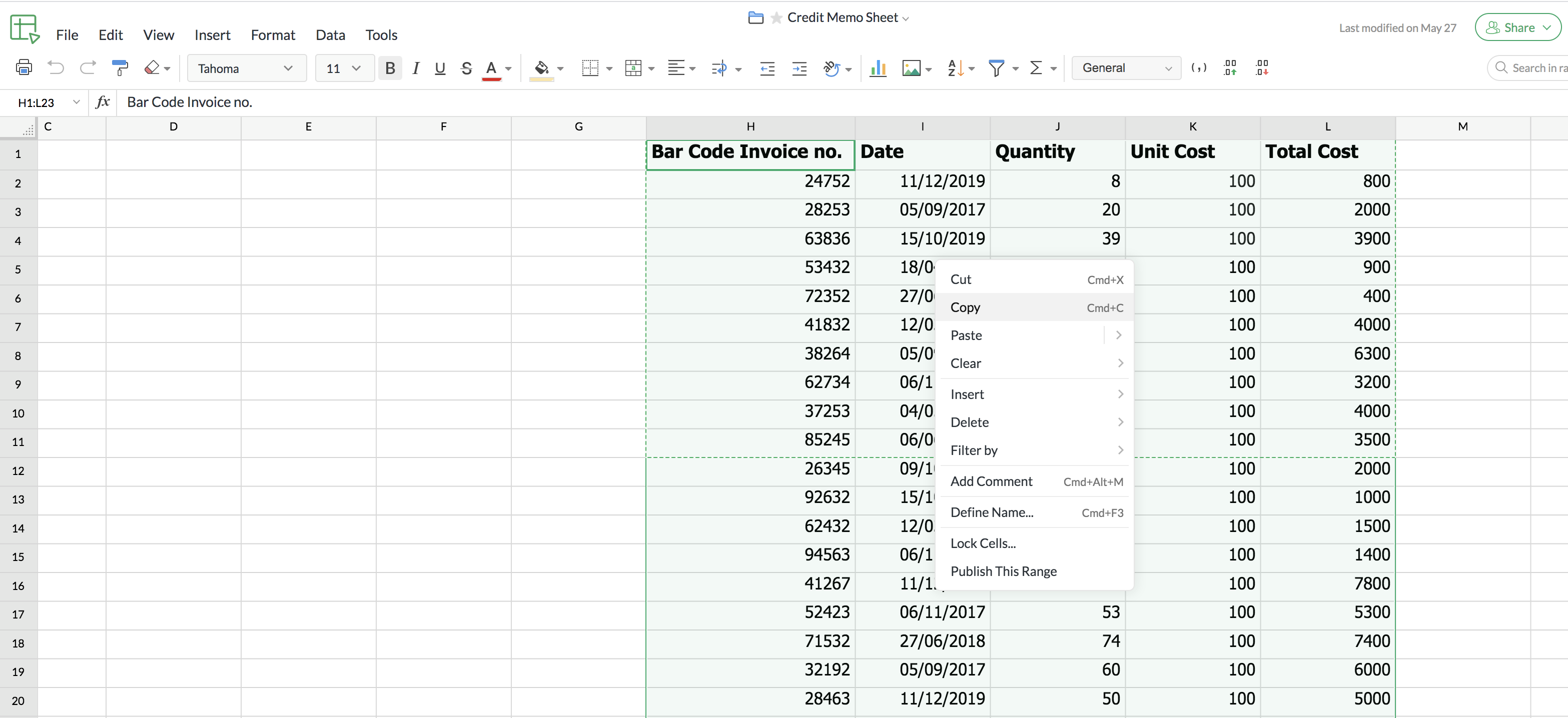 1. Open Zoho Sheet and simple select the table. Now right click on the table and select Copy.