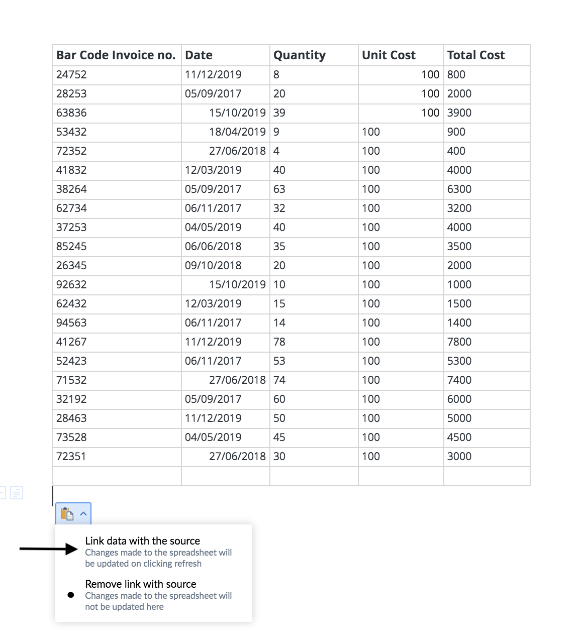 2. Now open your Writer document and simply paste the table you copied from Zoho Sheet. After pasting, select the option to Link data with the source from the bottom of the table. This will automatically update any changes made in Zoho Sheet to the table in Writer.
