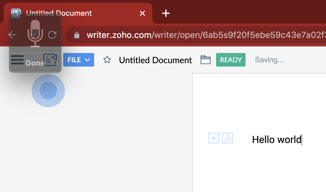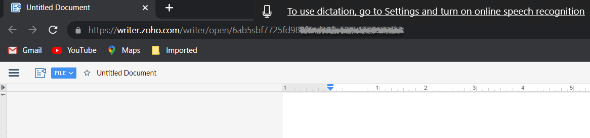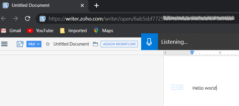 Now, if you click on 'Edit' option in the browser menu and click on 'start dictation', you will find a Microphone symbol (as shown below) which will allow you to speak and edit the document.