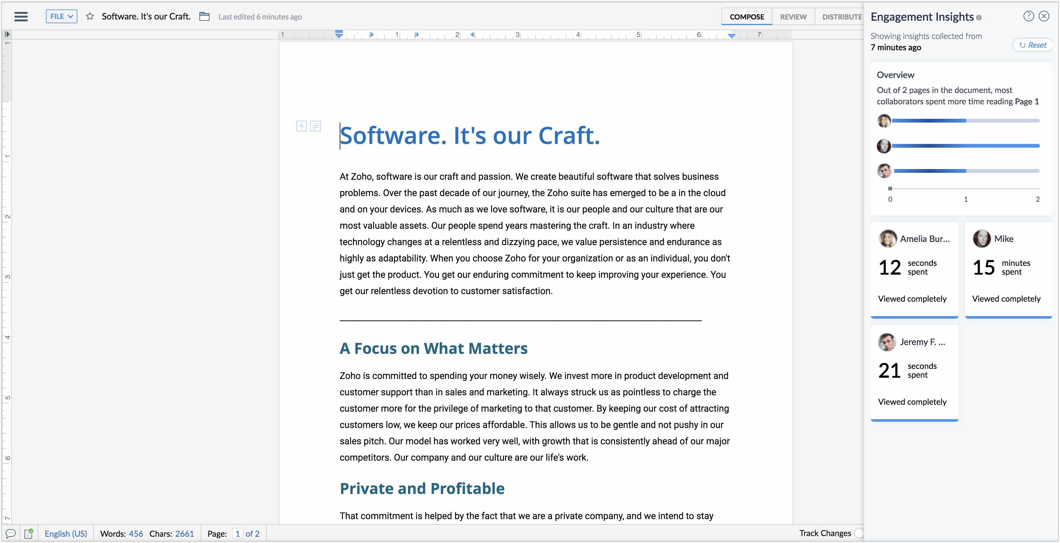 Engagement insights in Writer is a tracking system that gives you detailed statistics on your document views, opens, and how much time each of your recipient spent on the document. You can view per page analytics or track the statistics for the entire document.