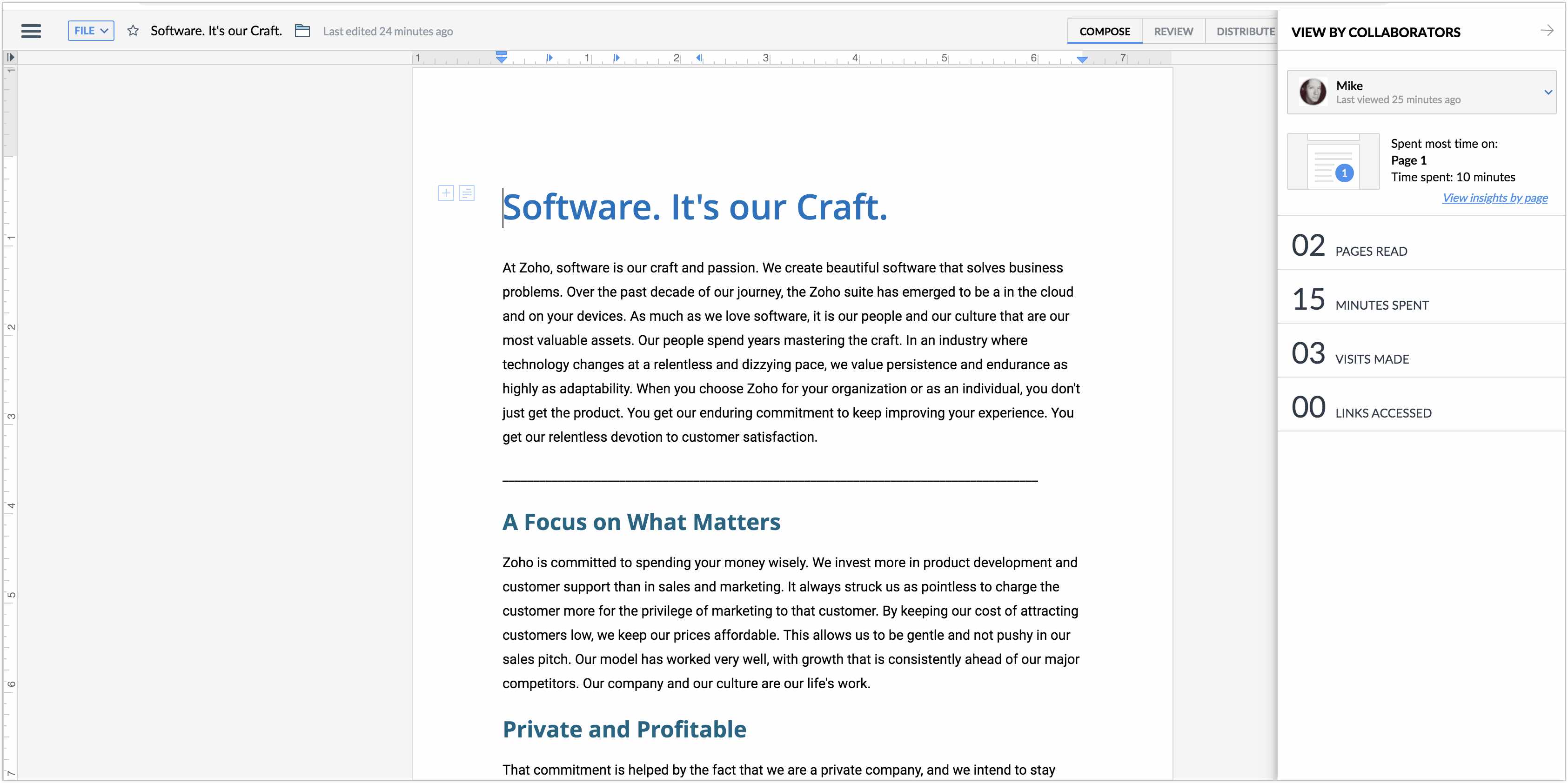 - You can also track the time spent, pages read, and visits made by each collaborator. Click on any collaborator name to view the engagement statistics of that particular user.