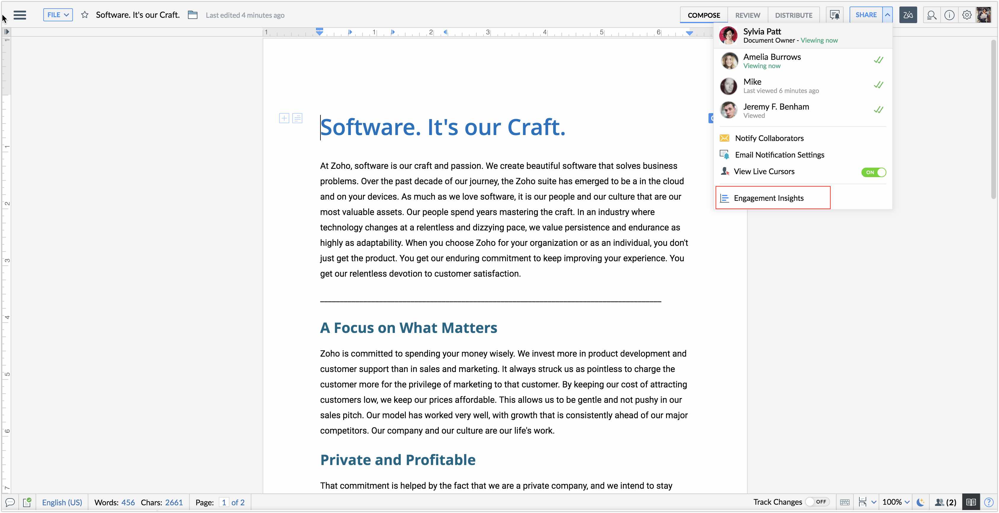 > Tools tab and click on the Engagement Insights option under the Analyser header. Alternatively, click the drop-down near the Share button and choose the "Engagement Insights" option. Learn more on Document Sharing.