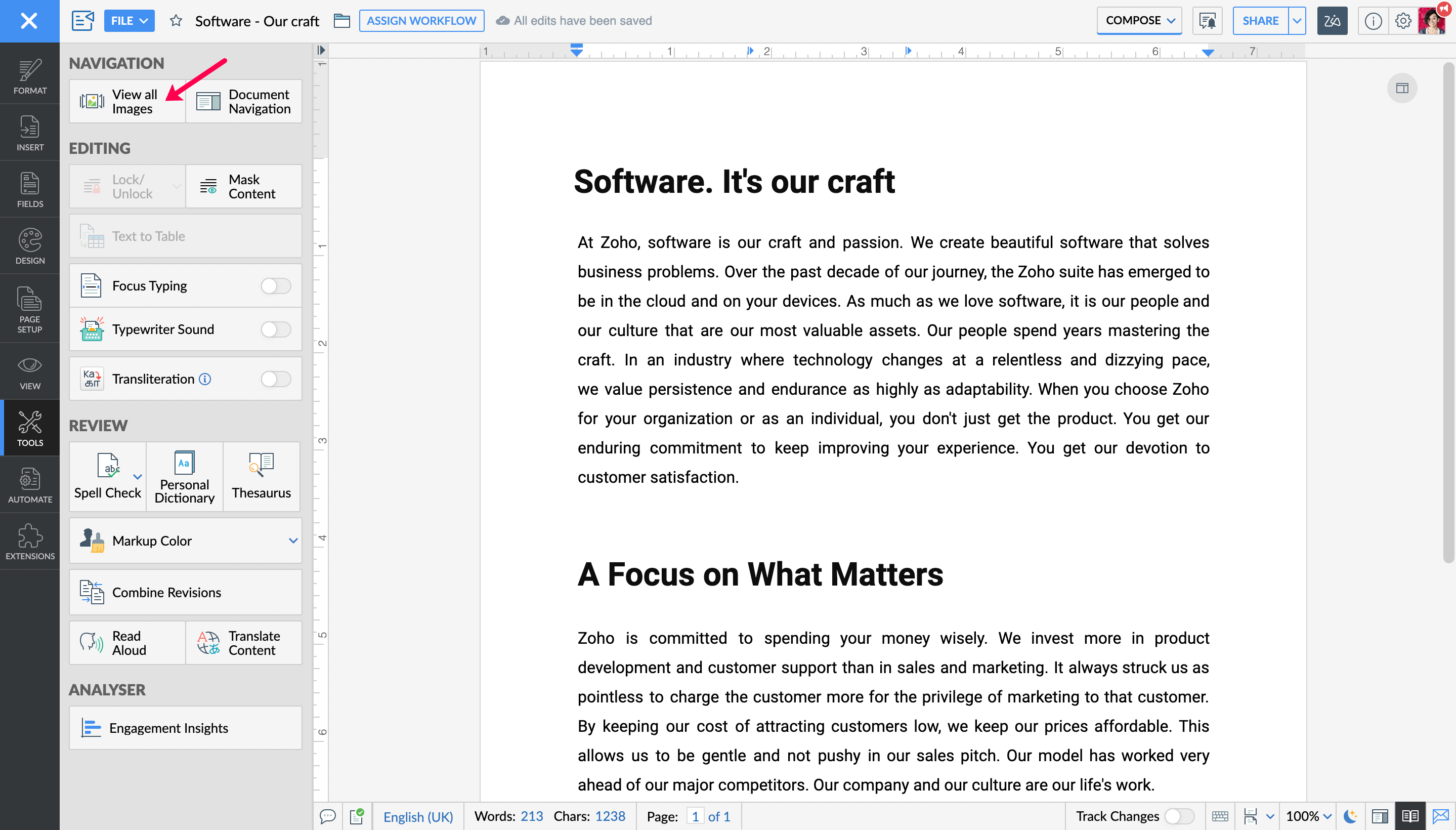 - Under the Navigation header, click View All Images. This will open a preview of all the images in the document. You can download or edit each image while you preview.