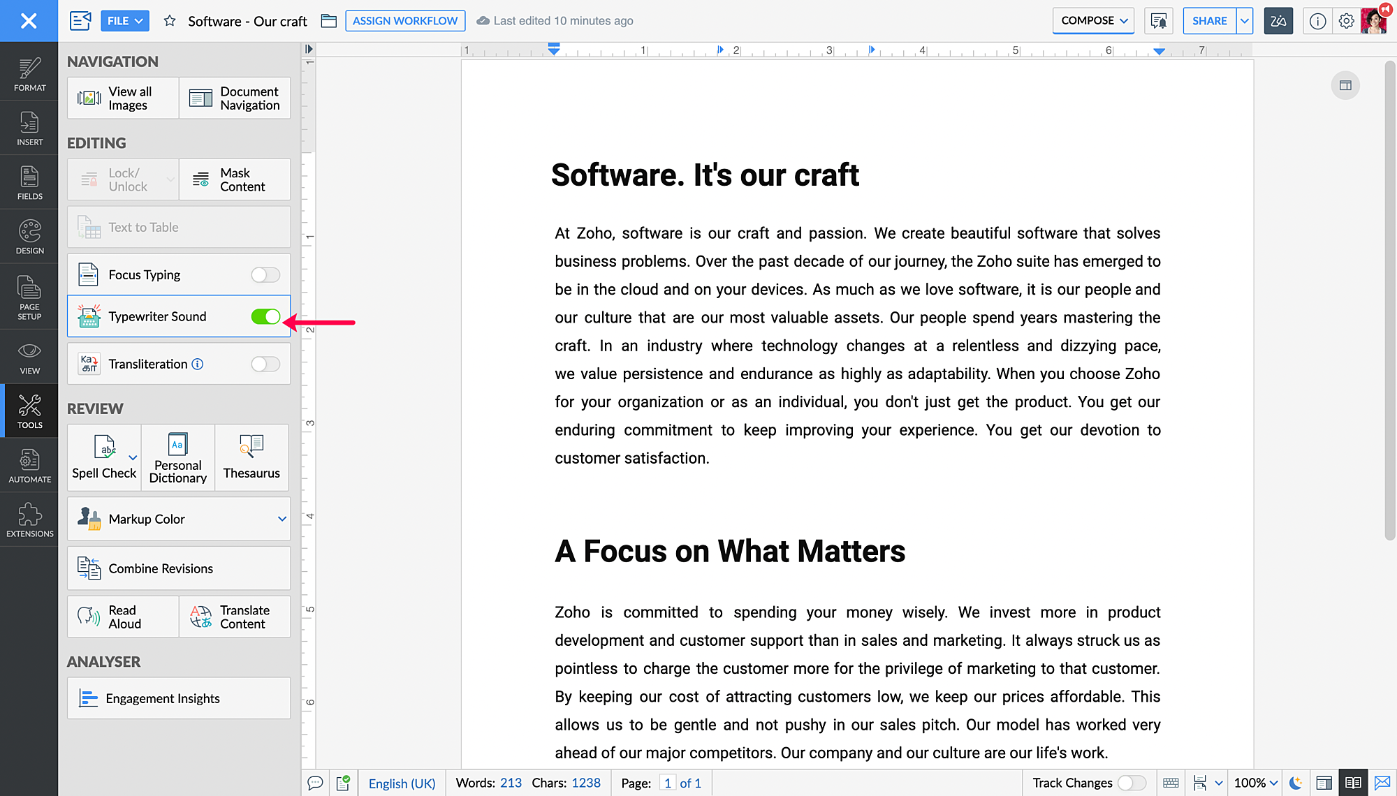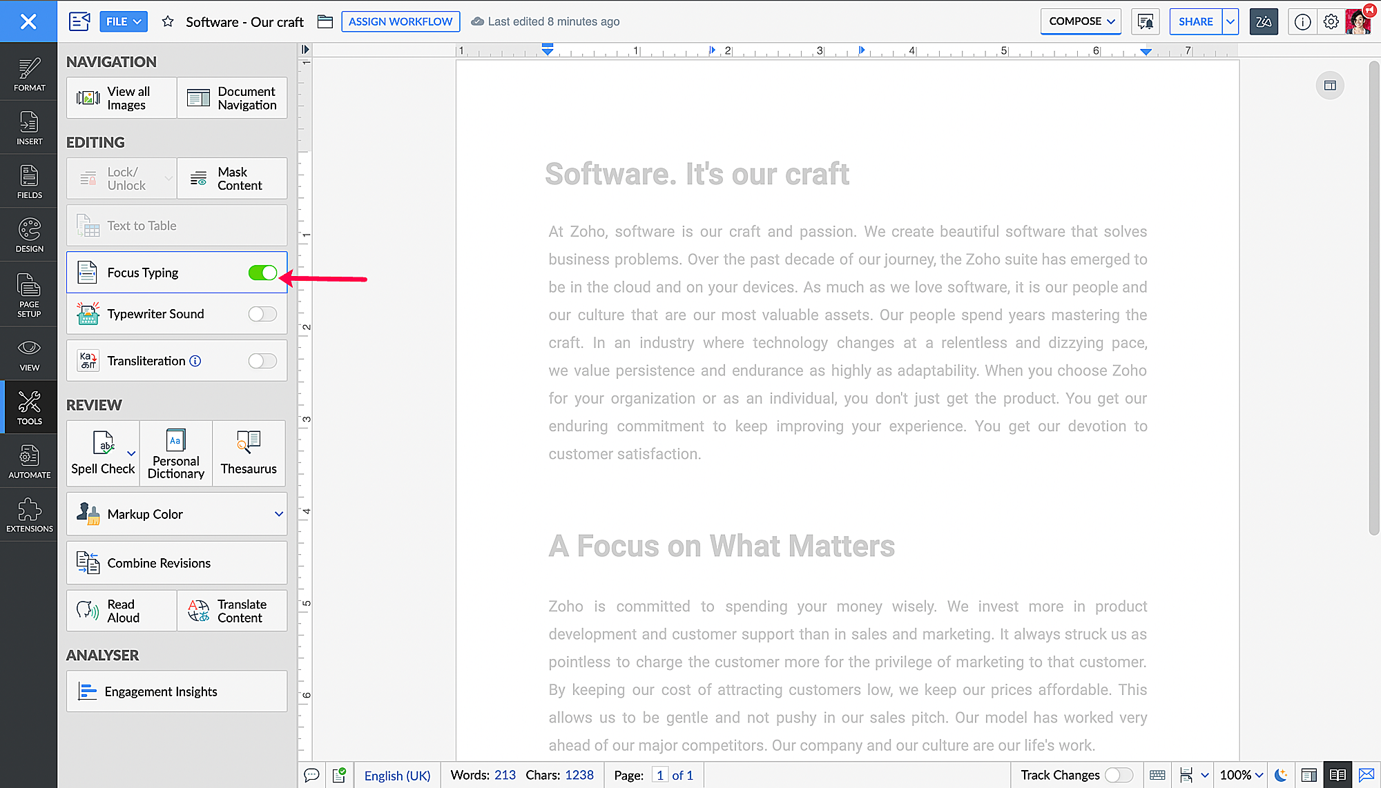 - Under Editing header, turn on the Focus Typing button. Now your entire document will look blurred. You can click on the paragraph you want to edit so that it gets highlighted and gives a better focus on the content. Once editing is done, you can disable the focus typing mode.