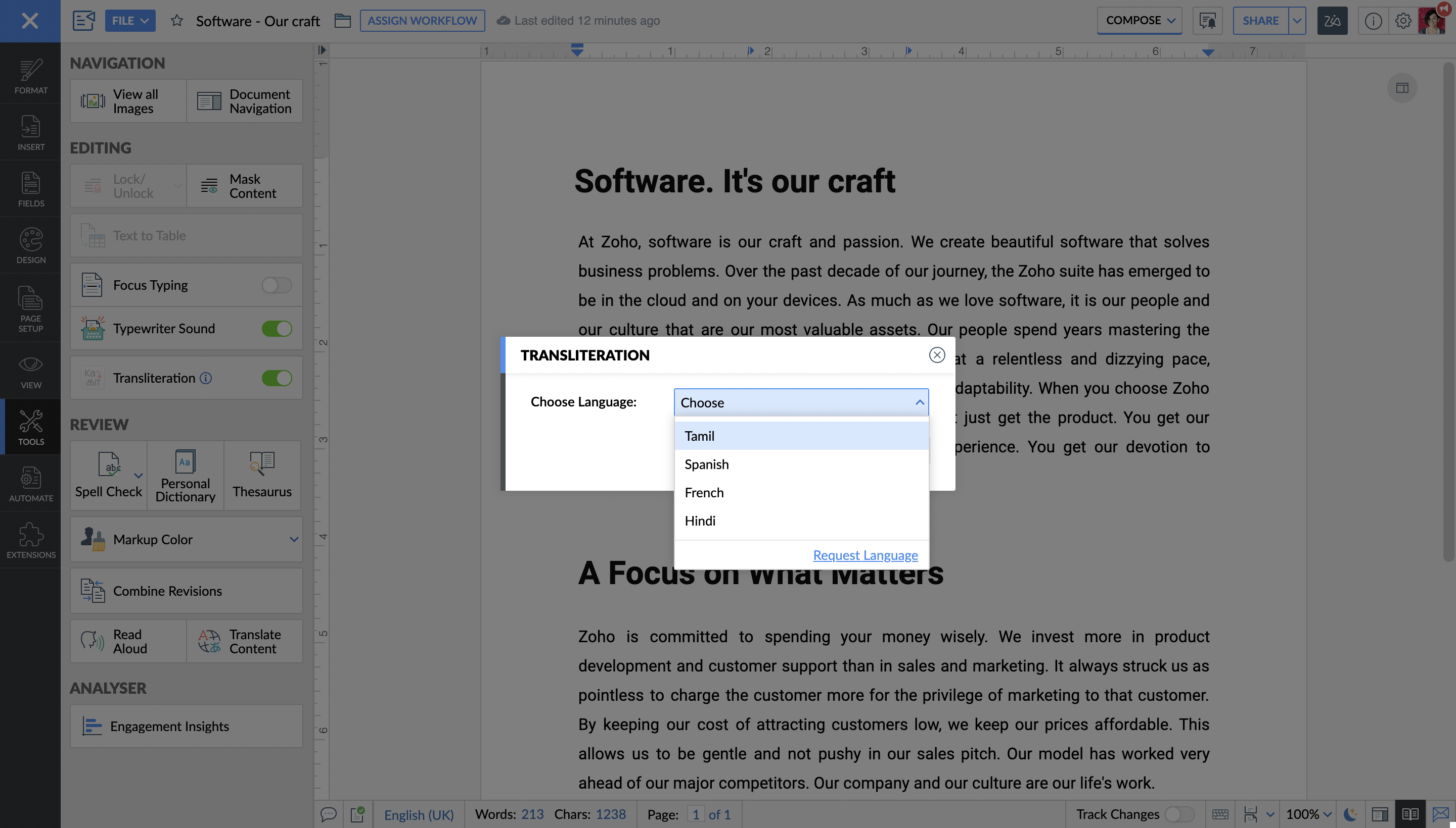 - The conversions are made based on pronunciation and not the meaning of the typed word. Currently, Writer supports transliteration in the following languages: Assamese, Bengali, Gujarati, Hindi, Kannada, Malayalam, Marathi, Odia, Punjabi, Tamil, Telugu.