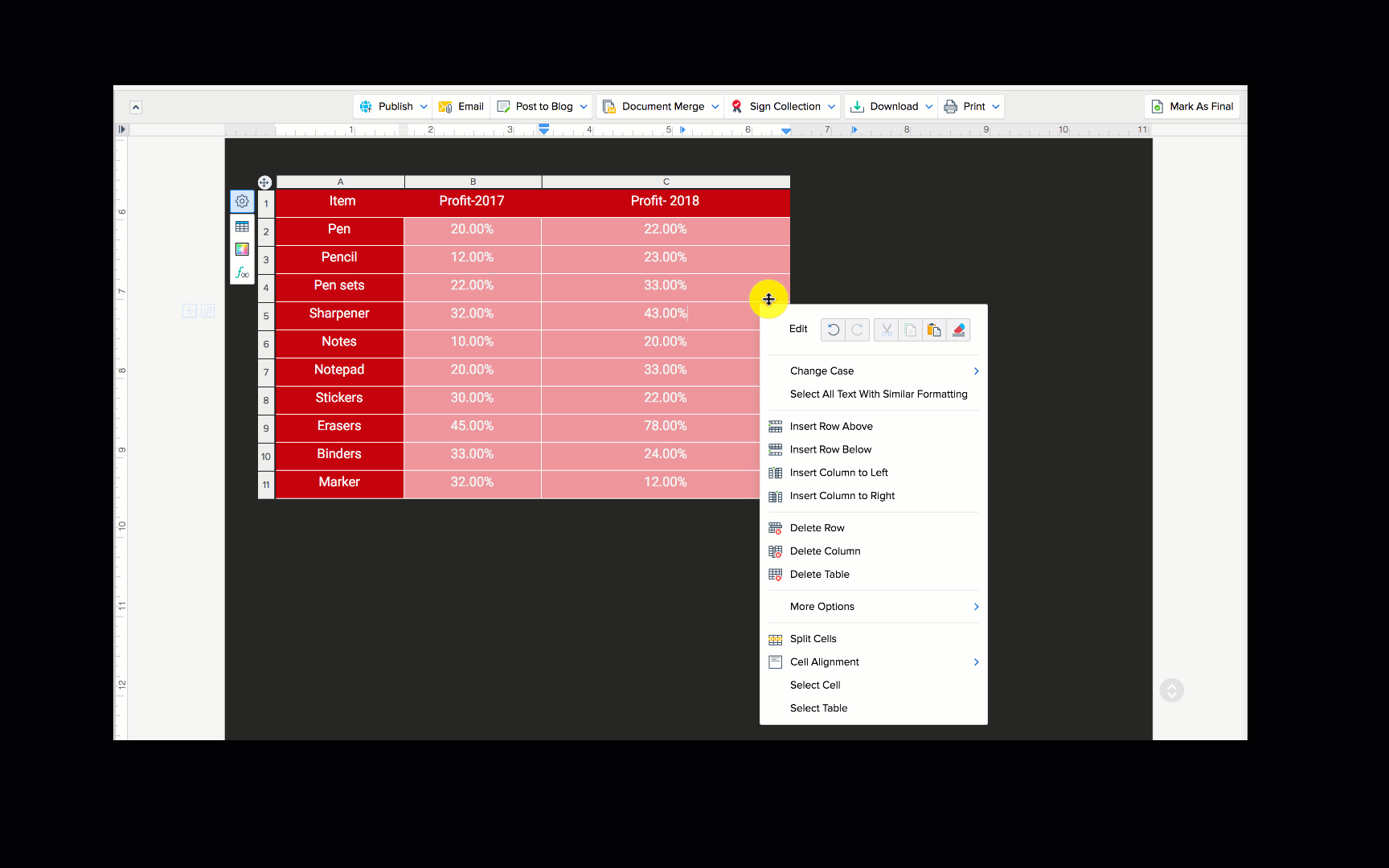 You can transform the table inserted in your document into charts. For example, if you are creating a business report and want to convert a table that has the yearly profits data into a graph, you can use the "Convert table to chart" option. You do not have enter the data in a Sheet or Excel file for converting the data. Instead, create a table in Writer and simply click “Convert table to chart” to make the conversion. Once the chart is created in your document, you can edit it anytime.