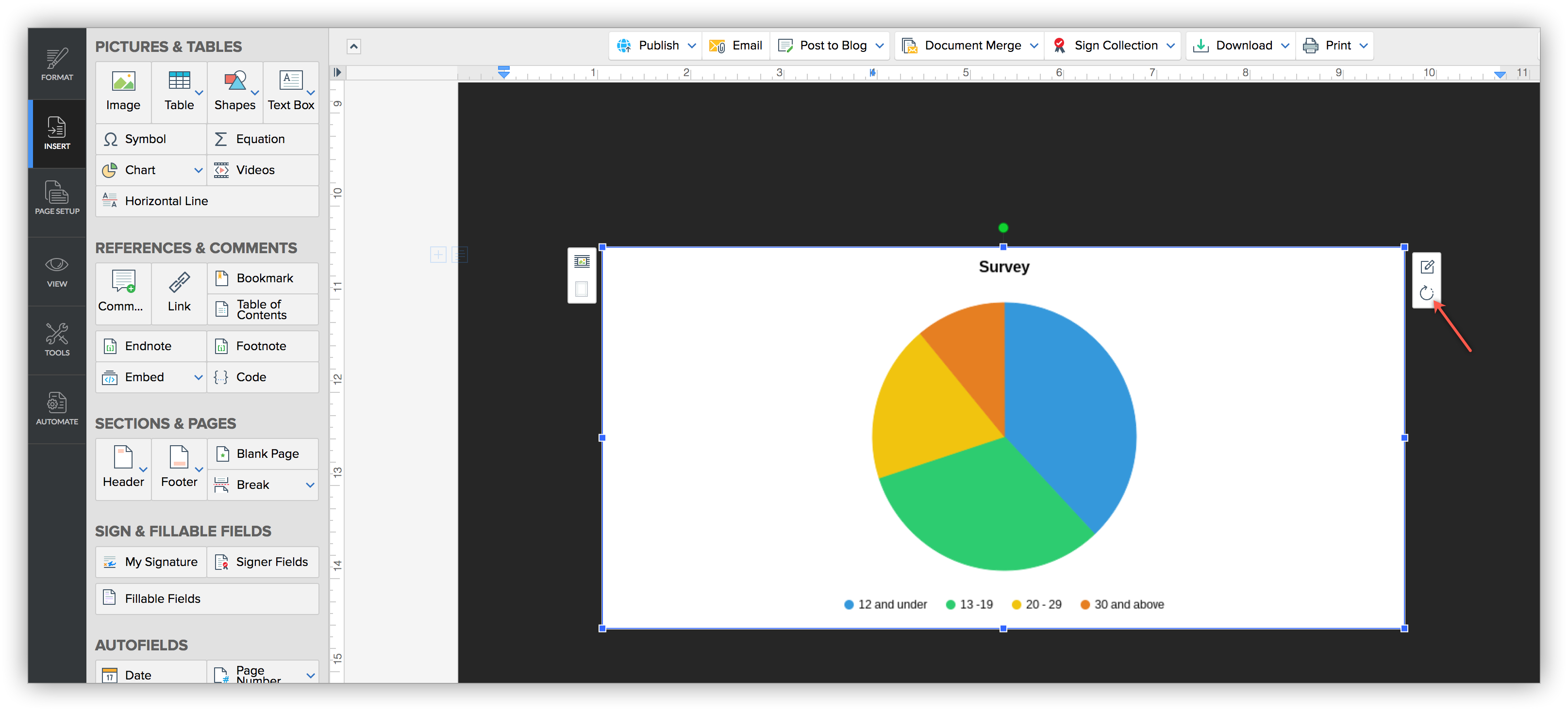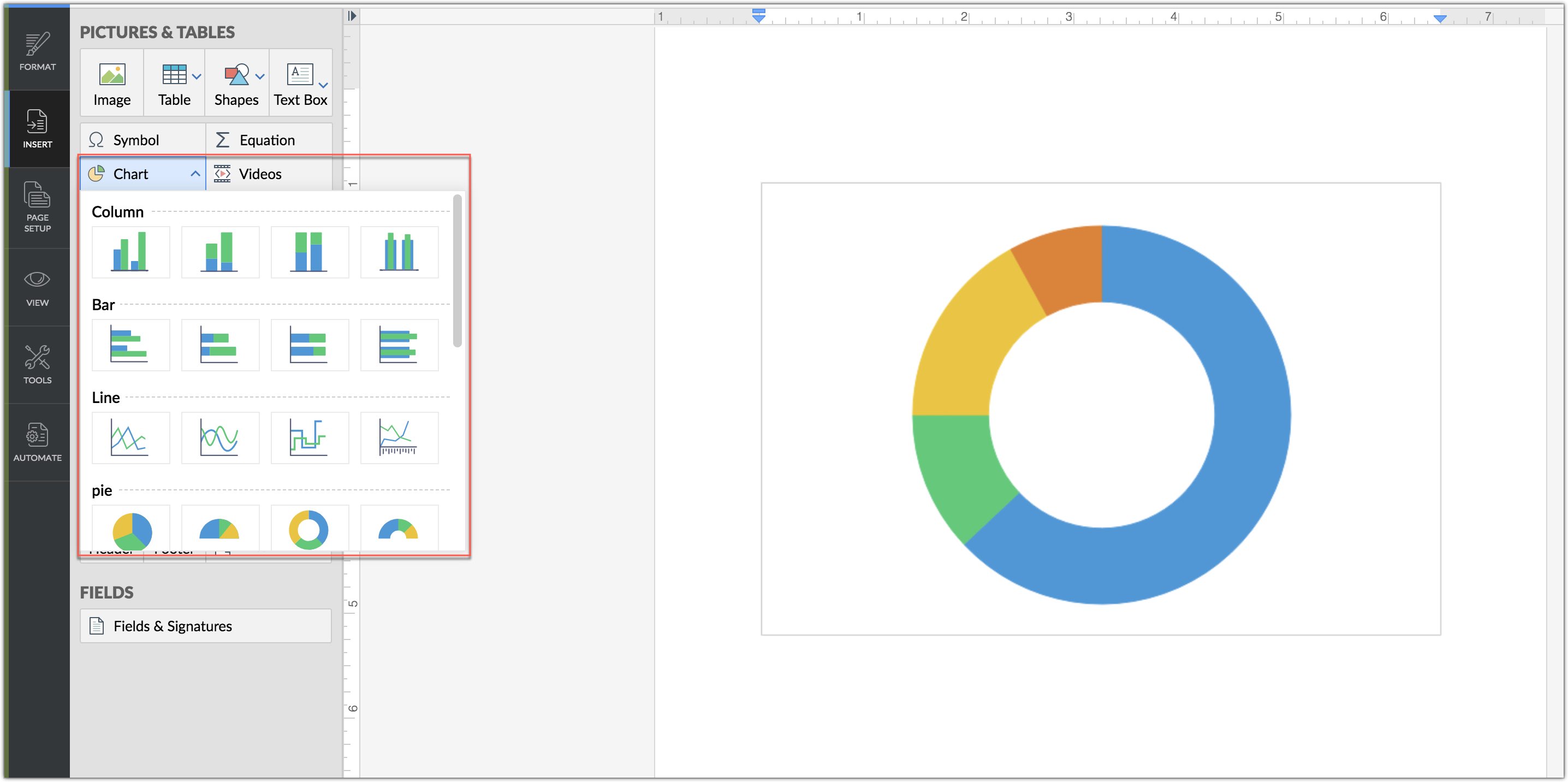 Once the chart is inserted in your document, you can edit and update the data linked to Zoho Sheet. Also, copy/paste charts as image files from MS Word and Google Docs.
