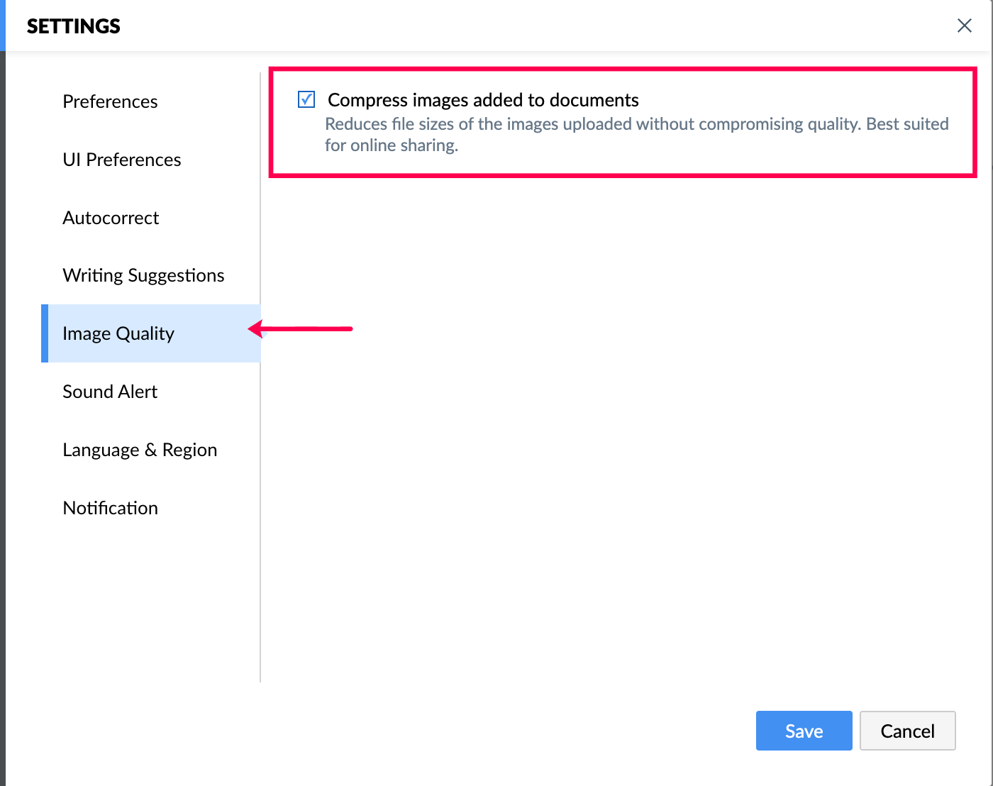 Inserting large images can significantly increase your document size and affect loading and collaboration performance. Zoho Writer includes a built-in image compression option that reduces file size without visibly affecting image quality. To ensure images are automatically compressed: