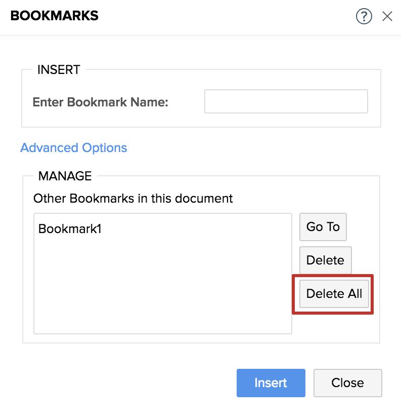 You can remove bookmarks by going to More Options(☰) > Insert References & Comments > Bookmarks. Once the Bookmark window is opened, click on Advanced Options to access additional operations like Go to, Delete, Delete All