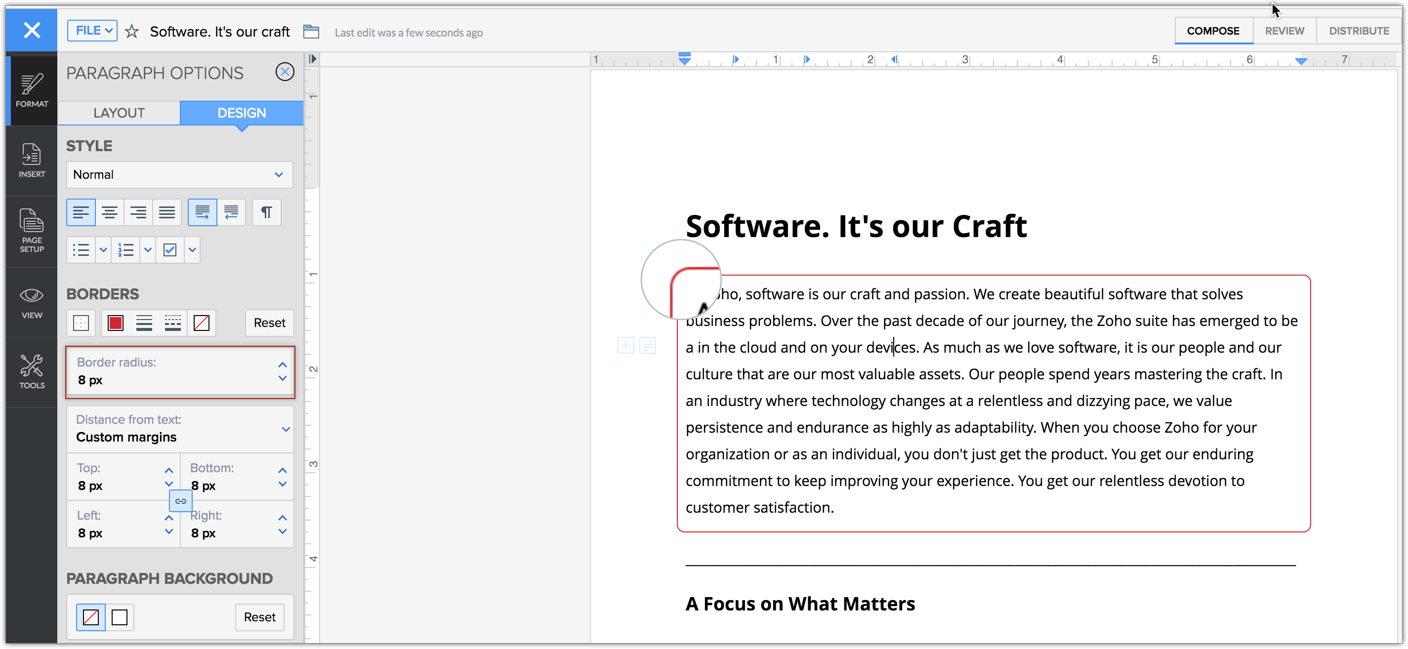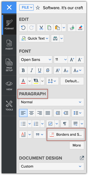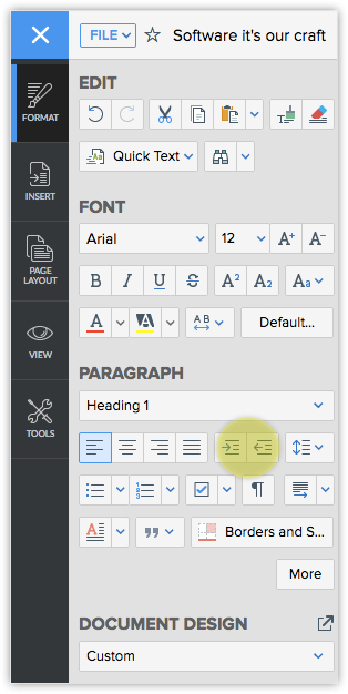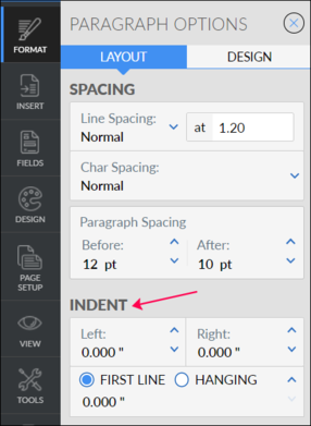 You can also set indentation for a certain paragraph using a horizontal ruler on the top. All you have to do is to select the paragraph and drag left/right indent icons to your preference.