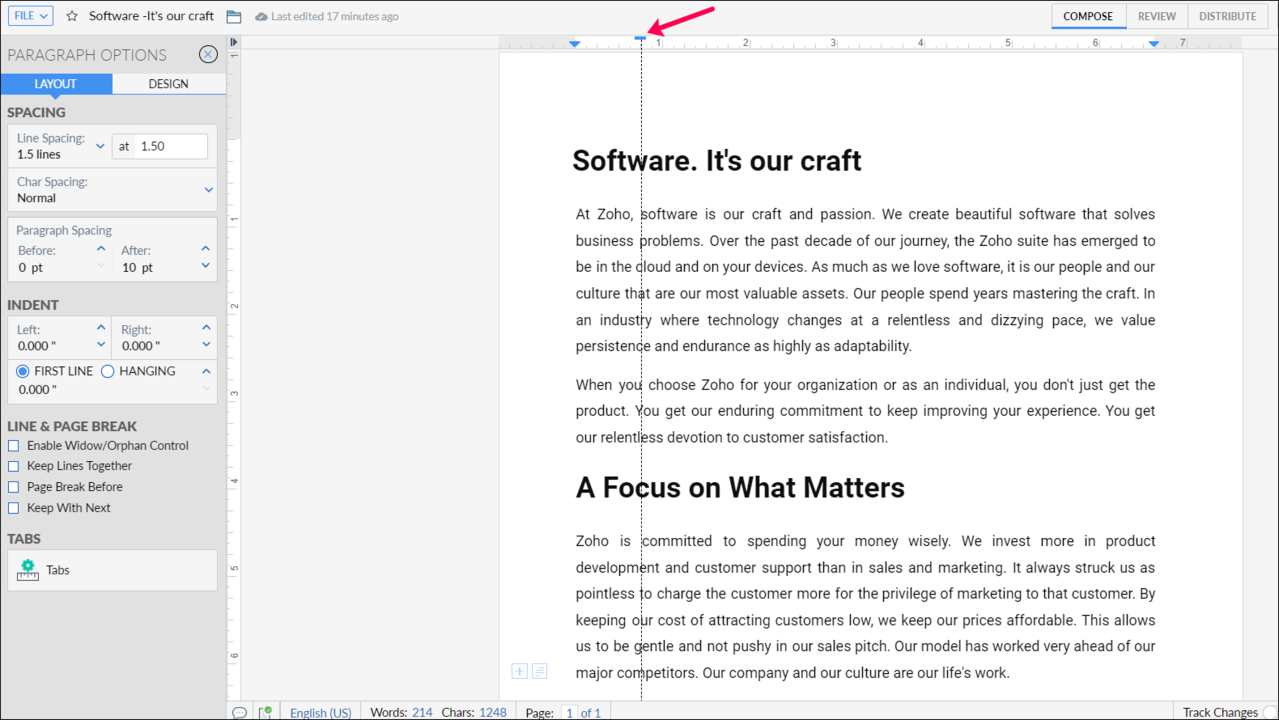 Set indent left/right using Ruler: Indentation can also be set by adjusting the Indent icon on the horizontal ruler on the top.