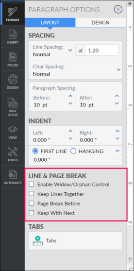 Enable Widow/Orphan - Adjusts the position of the paragraph to prevent a single line of text from being left at the top or bottom of a page.