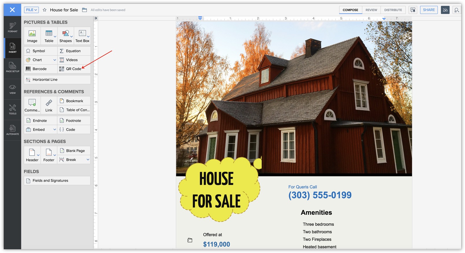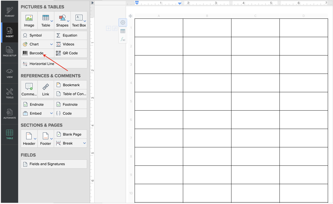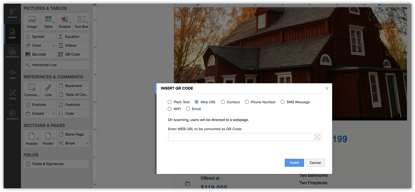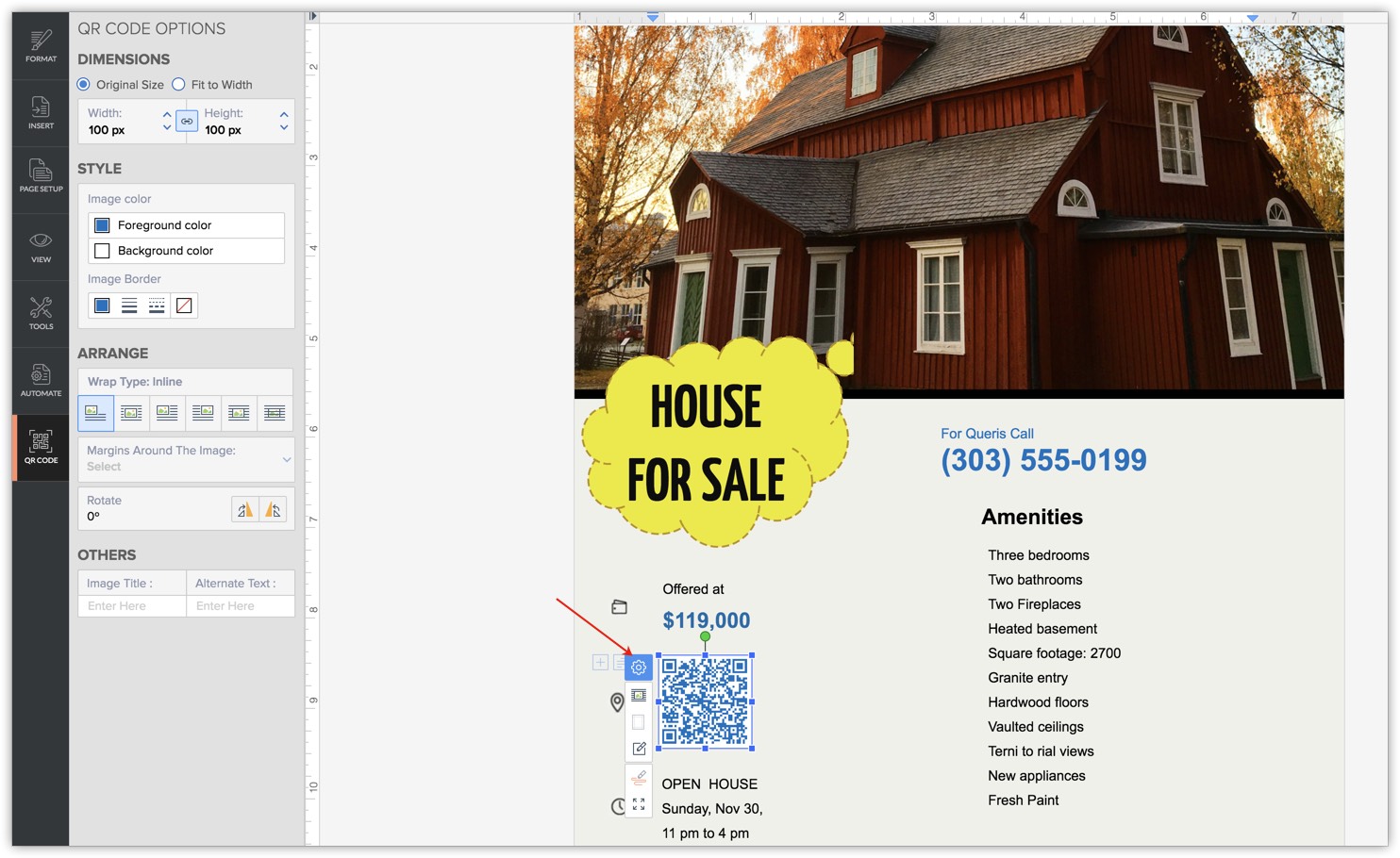 The Bar code and QR code will be inserted as an image. You can click on the inserted image and edit the color, background, size, add image border, and so on.