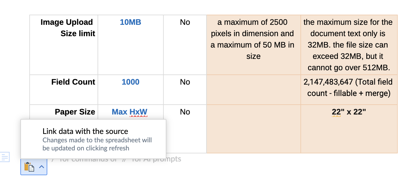(Optional) If you want to link an existing Zoho Sheet, copy the range you need from Zoho Sheet and paste it into Writer using the Link data with source option. This way, updates in the sheet reflect in your Writer document.