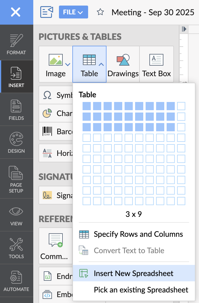 Insert a spreadsheet table by going to the menu bar and selecting Insert → Table → Spreadsheet Table.