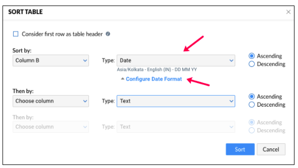 In Zoho Writer, you can sort a table column by date values. This is useful when you want to arrange events, logs, or records in chronological order. The “Sort Table” feature in Writer lets you pick which column to sort, specify that the column contains dates (and the format), and then apply ascending or descending order.