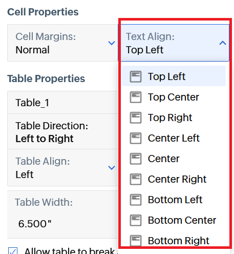 - Go to Cell Properties > Text Align.