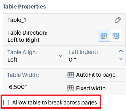 - To prevent rows or tables from breaking across pages: gear icon > disable Allow row to break across pages, or Allow table to break across pages respectively.