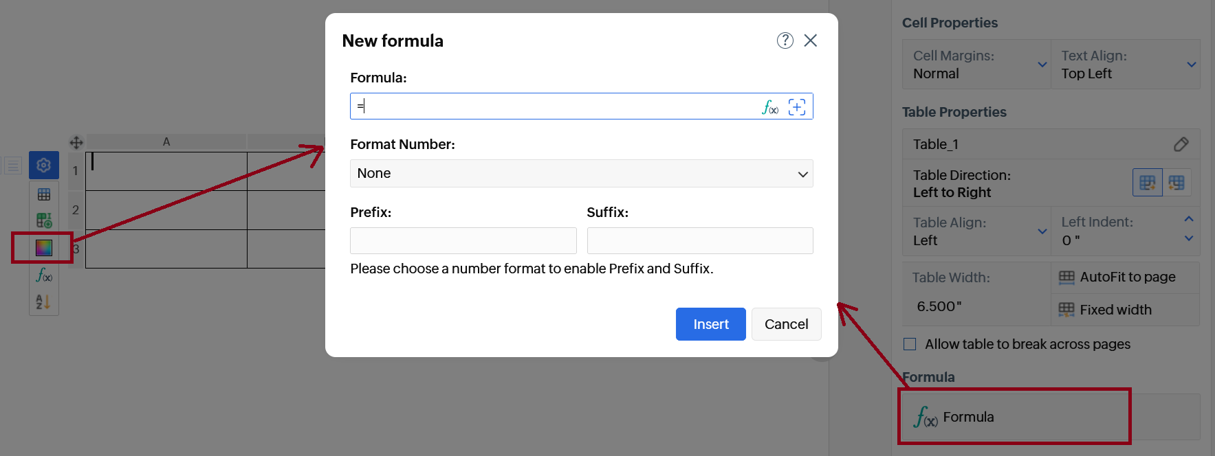 - Enter a formula or pick one from list (e.g., SUM, AVERAGE, IF, COUNT, MAX, MIN, PRODUCT, etc.). Use cell references or keywords like LEFT, ABOVE.