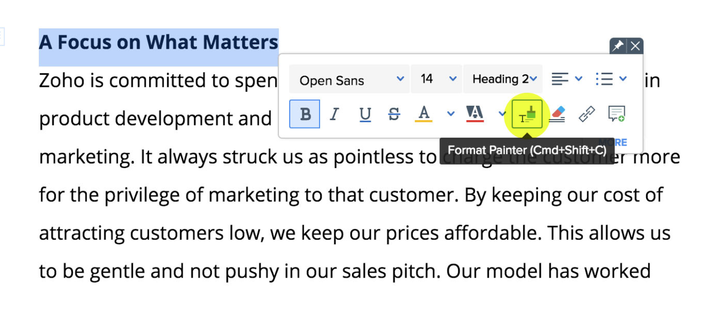 2. Click the Format Painter icon. Alternatively, go to More Options(☰) > Format tab > Format Painter icon. The cursor will turn into a gloved hand.