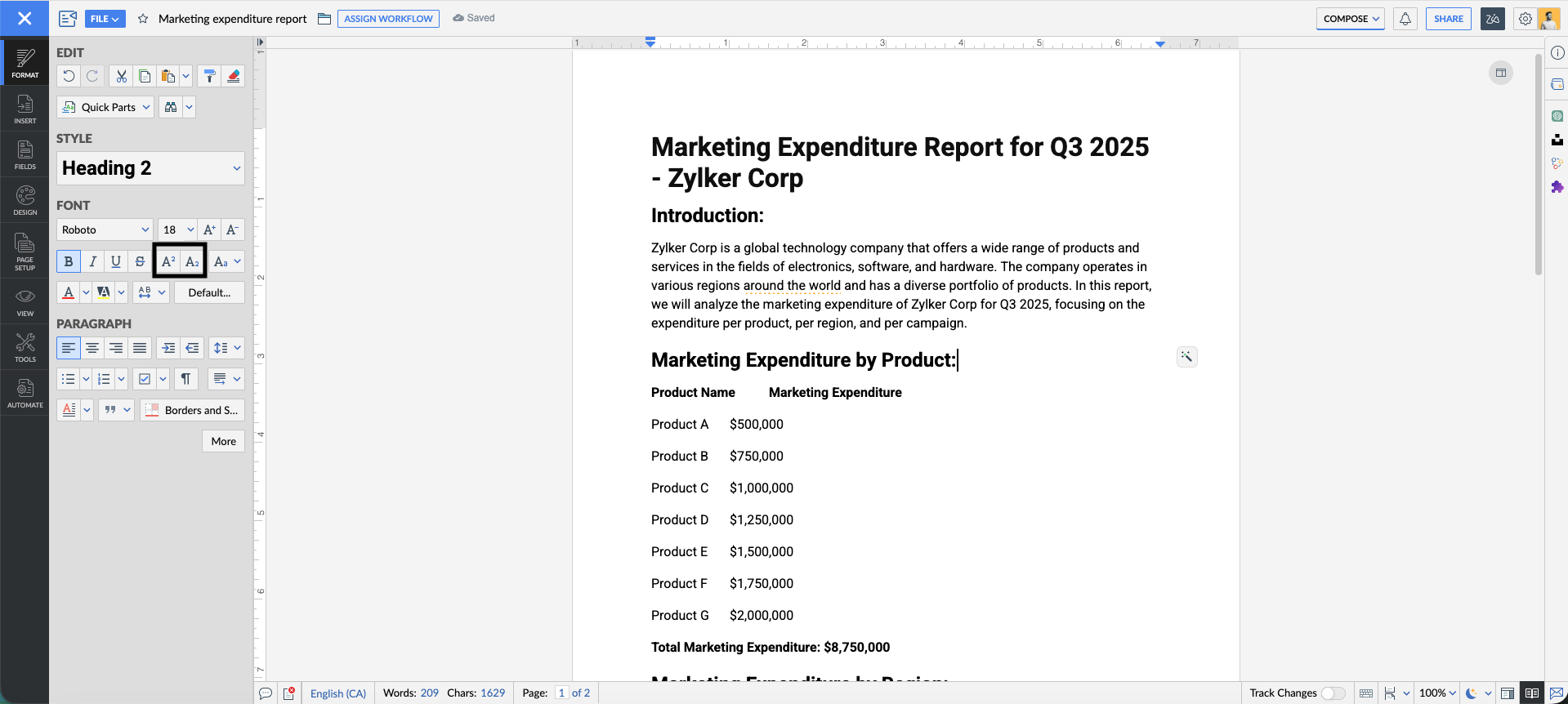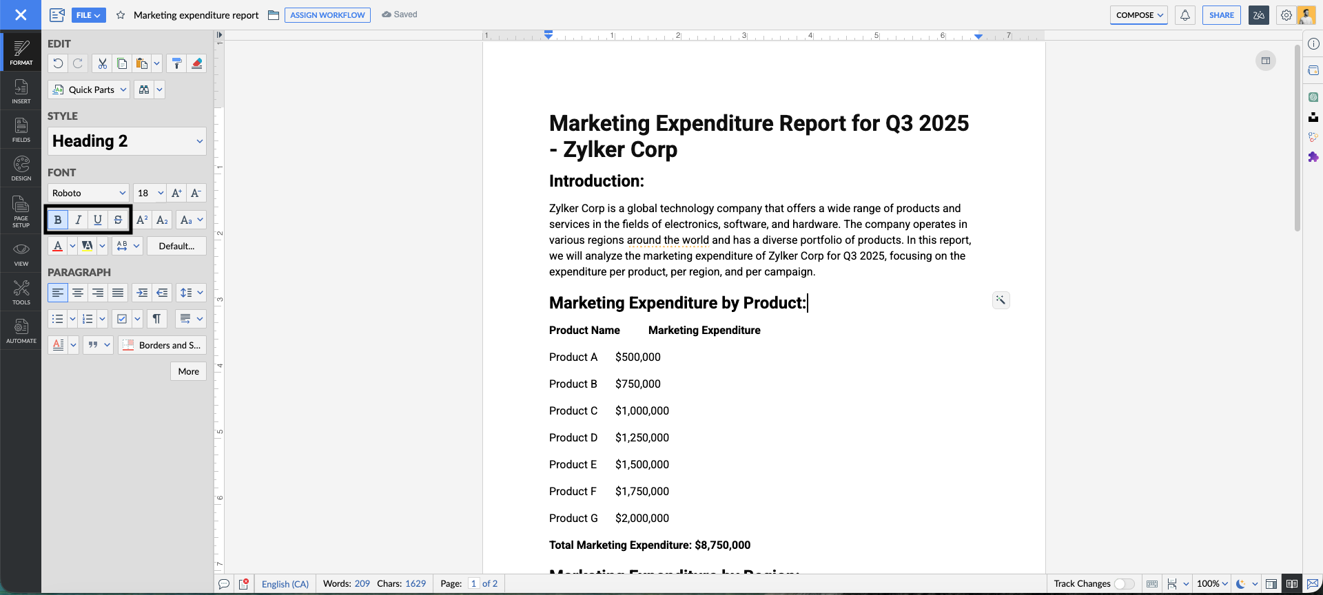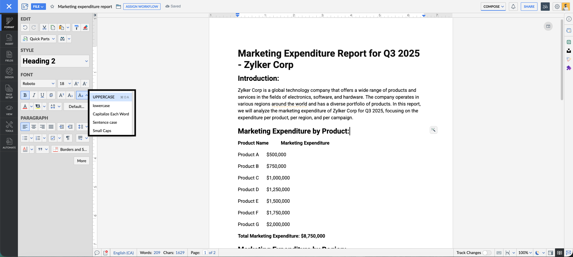 Zoho Writer’s built-in Translation feature allows you to instantly translate your document content into 70+ languages without leaving the editor. Whether you're collaborating across regions or localizing customer communication, the Translate tool helps you break language barriers with ease.