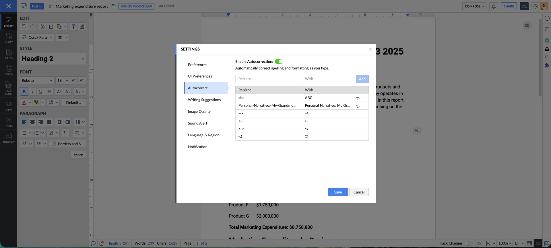 - Click the Settings icon on the top right corner of your screen > Autocorrect.