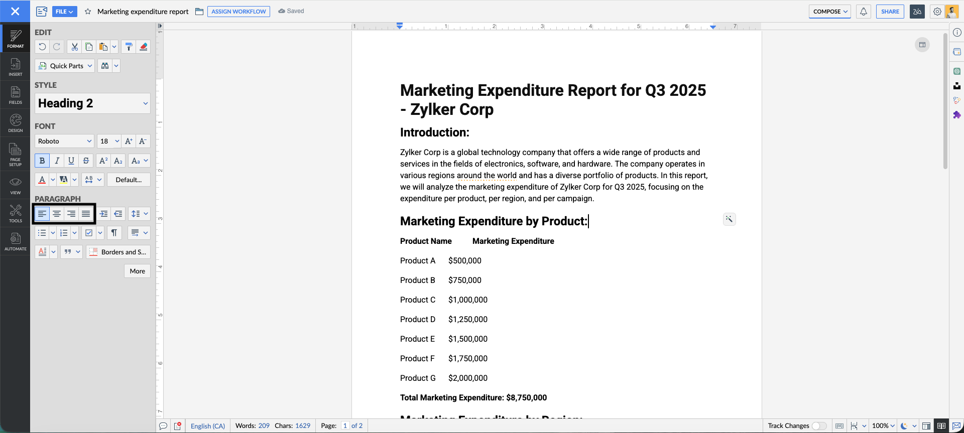 You can use different text alignments in your document based on the way you present content. Most often, center alignment is used for headings and left alignment for paragraphs. If you want the content to fit in between the left and right margins, you can use justified alignment. Right alignment is used in rare cases like making attributions to authors when you quote them in your document.
