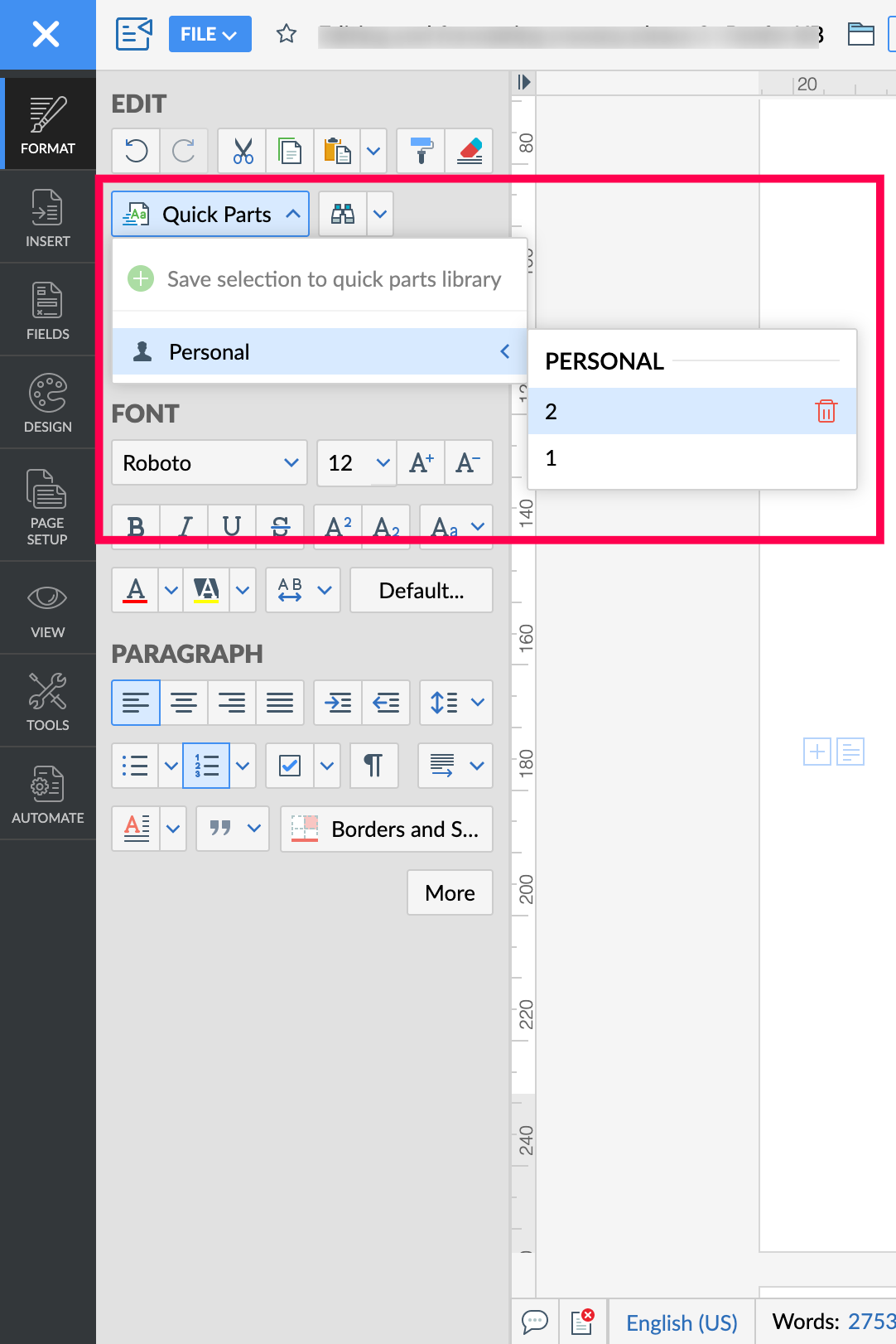 The Quick Part Library in Zoho Writer lets you save and reuse content blocks such as signatures, disclaimers, clauses, tables, boilerplate text, or formatted sections across any document. Instead of copying content manually from old files, you can insert saved blocks in one click and maintain consistency across all your documents.