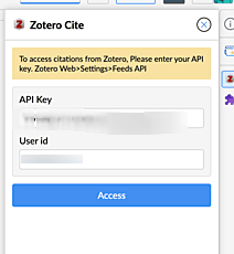 - Configure the copied API Key and User Id as shown to connect to Zotero for you cite or add new references.