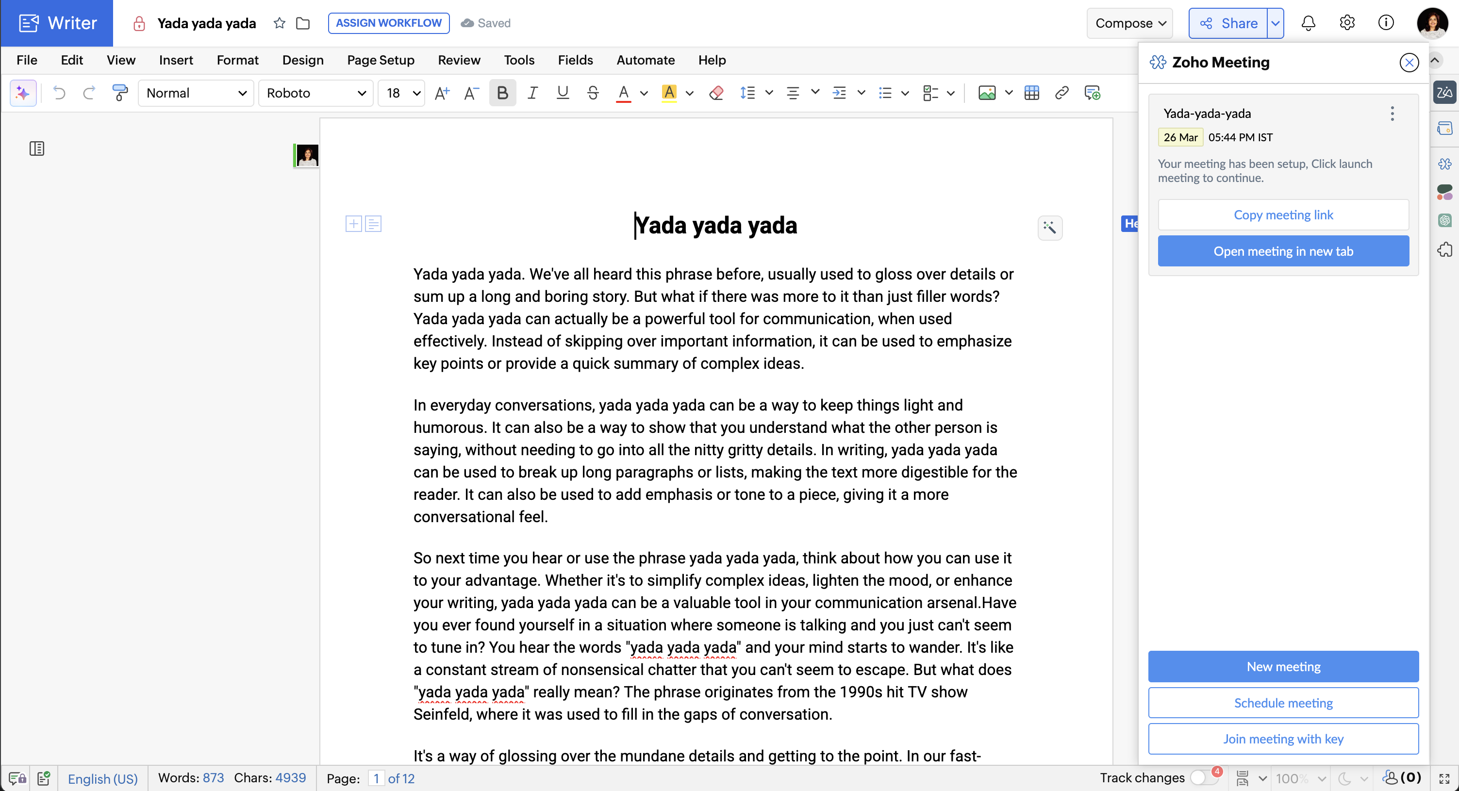 The integration of Zoho Meeting and Zoho Writer is to enable you to schedule and start virtual meetings directly from within your document. As a prerequisite, the document owner and collaborators will need a Zoho Meeting account and the Zoho Meeting extension.